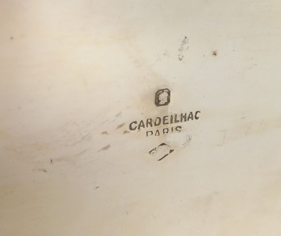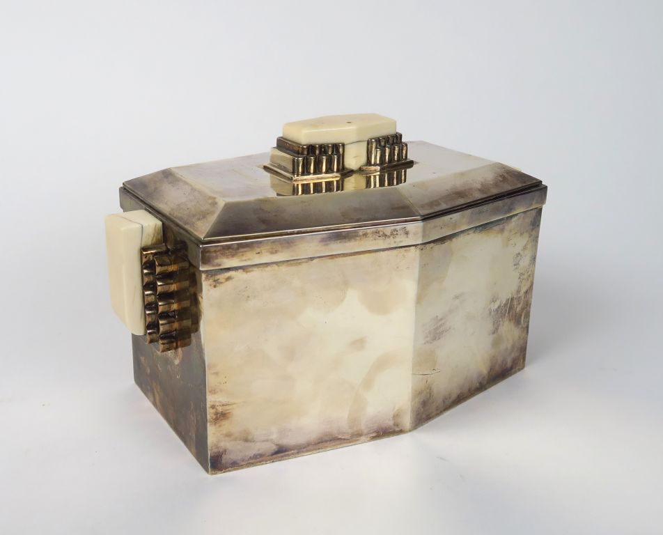 CARDEILHAC. Boite couverte Art Déco en argent, poinçon Minerve, prises en ivoire. Signée. Poids tel : 1 020 g (petits fels à l'ivoire)