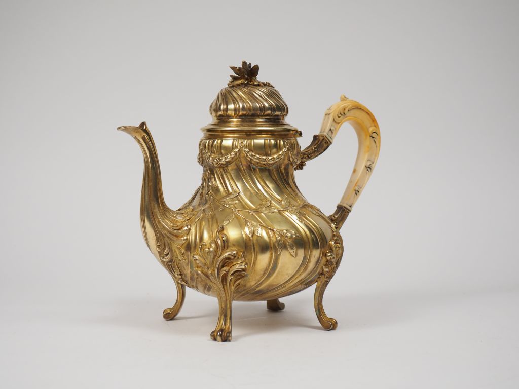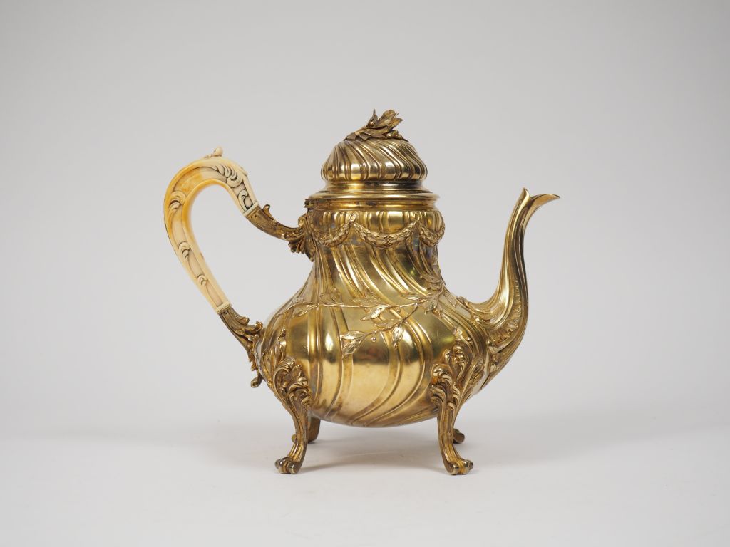 CARDEILHAC. Théière de style rocaille en vermeil, poinçon Minerve, à décor de feuillage et de guirlande de feuilles de lauriers sur fond de côtes torses, reposant sur quatre pieds griffe, anse en ivoire sculpté, prise en forme de feuilles et de baies. Poids tel. 1005 g