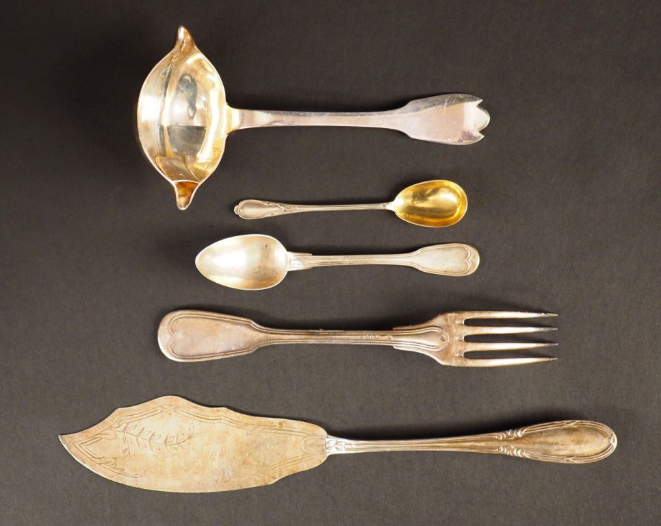 CARDHEILAC Cuillère à sauce en argent, poinçon Minerve. Long. 17,5 cm Poids. 115 g On y joint une pelle à tarte, une cuillère à œuf, une cuillère à dessert en argent, poinçon Minerve et une fourchette en argent 800 millièmes. Poids. 170 g