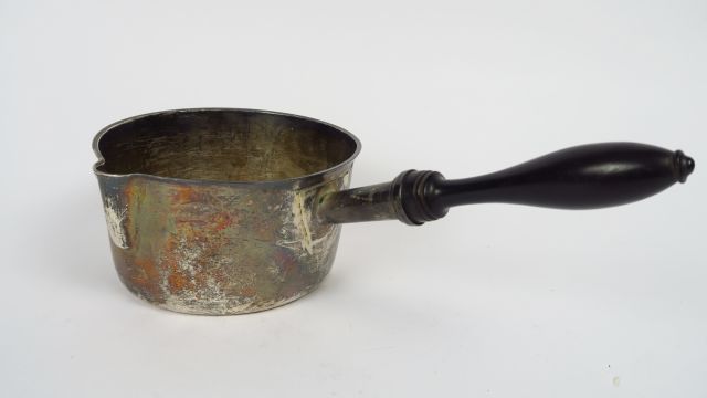 Casserole en argent, poinçon Minerve, monogrammée, manche ébène. Poids : 300 gr