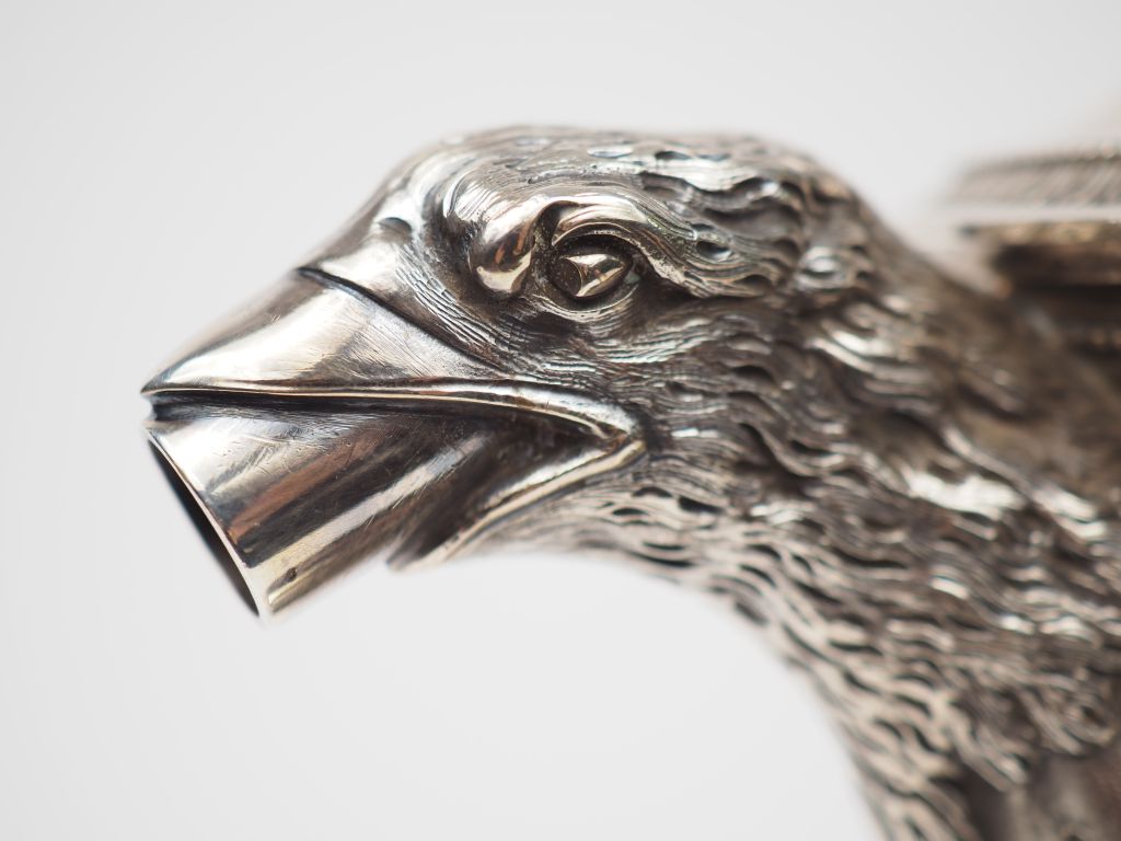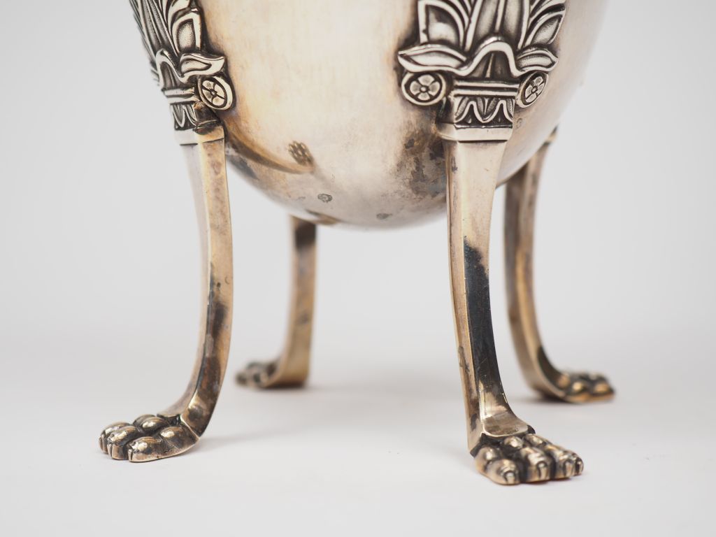 Chocolatière de style Empire en argent ciselé, poinçon Minerve,à décor de palmettes, bec verseur en forme de tête d'aigle, prise en forme de dauphin, reposant sur quatre pieds griffe. M.O : J. FONTAN à Bordeaux. H. 29,5 cm Poids. 865 g