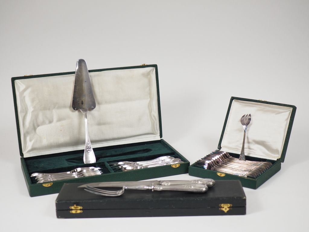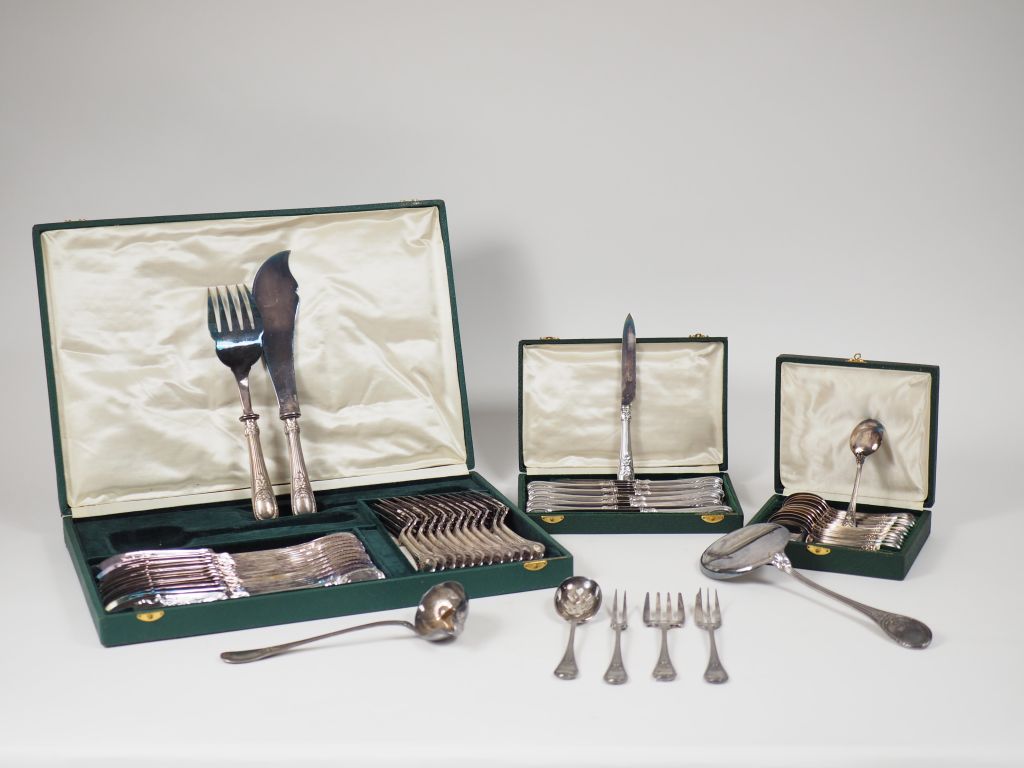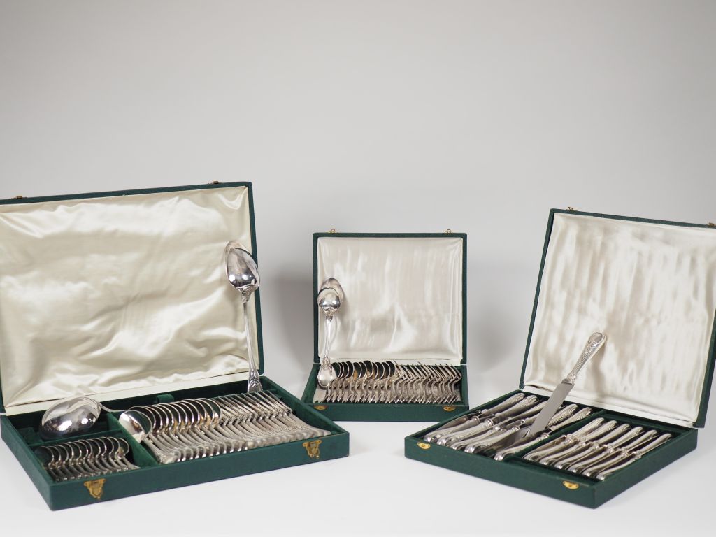CHRISTOFLE. Importante ménagère de style Louis XVI en métal argenté, à décor de feuillage. Comprenant : - douze grands couverts - une louche - une cuillère à ragoût - douze cuillères à dessert - douze couverts à entremets - douze grands et douze petits couteaux - douze fourchettes et un pelle à gâteaux - douze couverts et un couvert à servir le poisson - douze couteaux à fruits - douze cuillères et une cuillère à servir la glace - un couvert à découper le gigot - un nécessaire à douceurs - une cuillère à sauce - douze fourchettes à huitre. Dans des écrins.