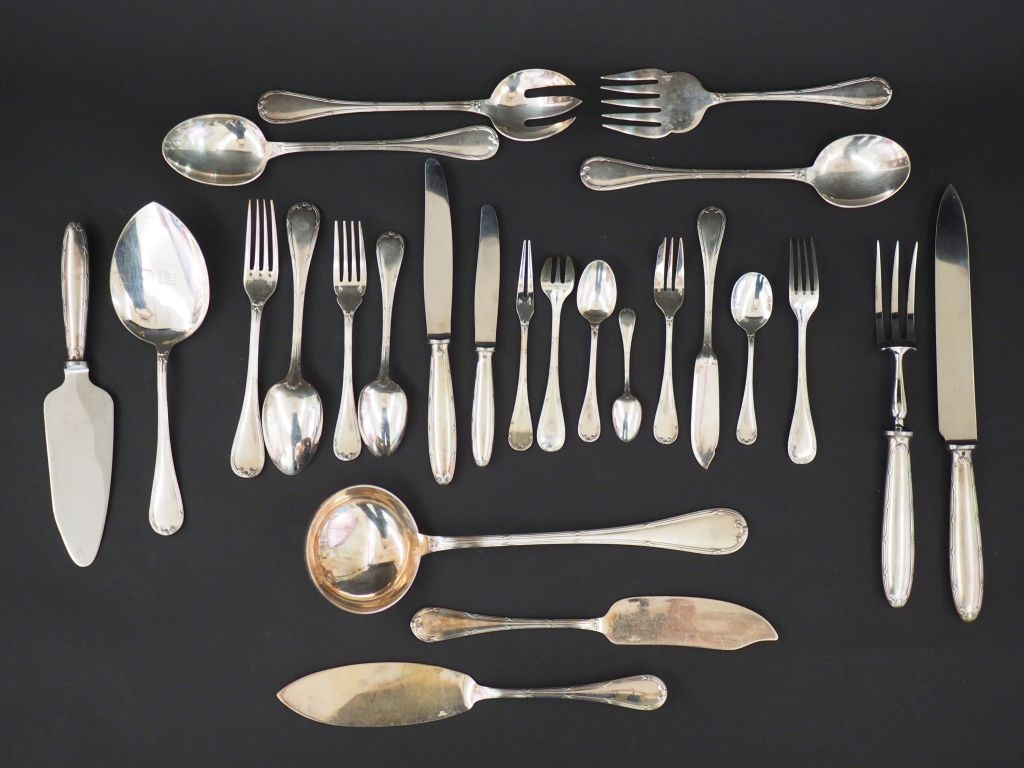 CHRISTOFLE. Ménagère de style Louis XVI en métal argenté, à décor de tiges enrubannées. Comprenant : - douze grands couverts - douze couverts à entremets - douze grands couteaux - douze petits couteaux - douze fourchettes à coquillage - douze fourchettes à huitre - douze petites cuillères - douze cuillères à moka - douze couverts à poisson - douze cuillères à dessert - douze fourchettes à dessert - onze pièces à servir