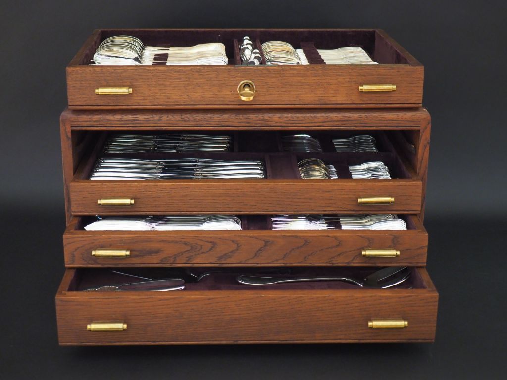 CHRISTOFLE. Ménagère en métal argenté dans son coffret, modèle à double coquille comprenant : - 12 grands couverts - 12 couverts à poisson - 12 couverts à dessert - 12 cuillères à glace - 6 porte couteaux - pièces de service dans son coffret d'origine en chêne à quatre tiroirs, poignées en bronze