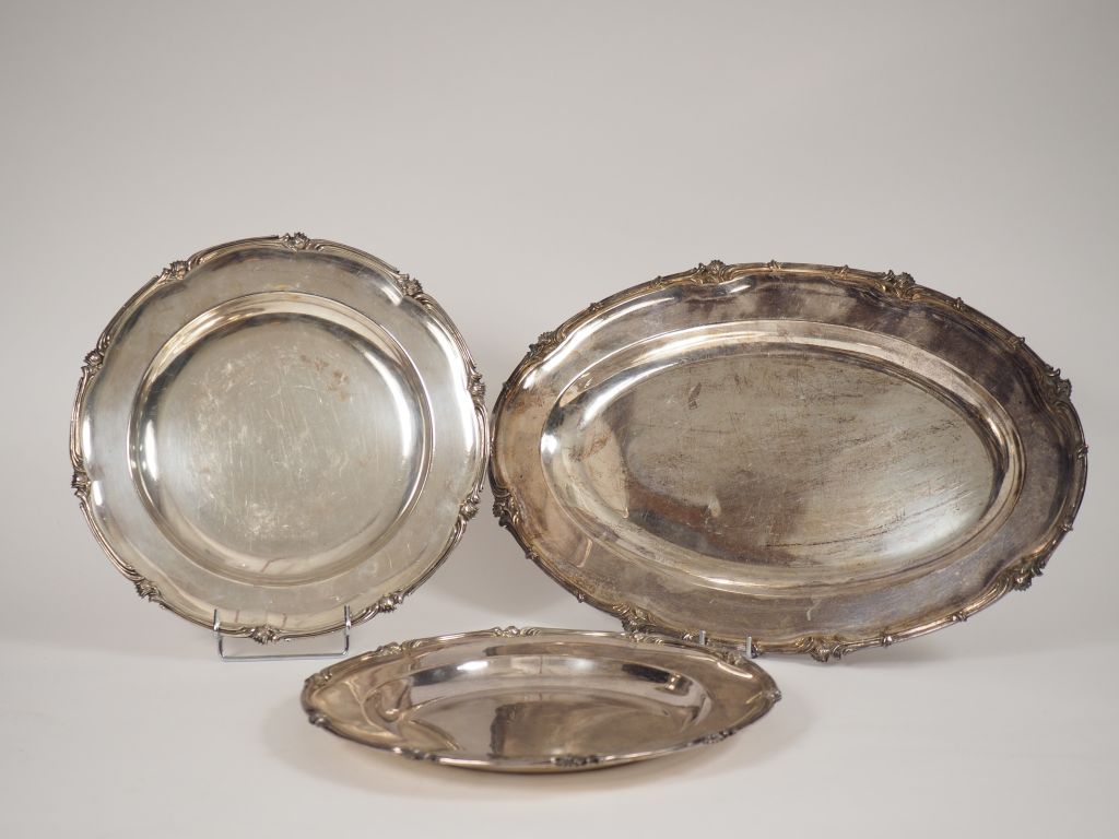 CHRISTOFLE. Paire de plats ronds et plat à poisson en métal argenté de style Louis XV, bords chantournés à décor de motifs feuillagés.