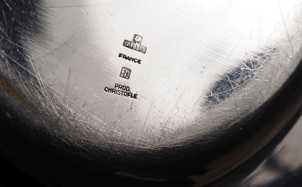 CHRISTOFLE. Saucière, 2 jattes rondes , un plat creux ovale, un grand ravier en métal argenté , Signés On y joint 2 assiettes à bouillie