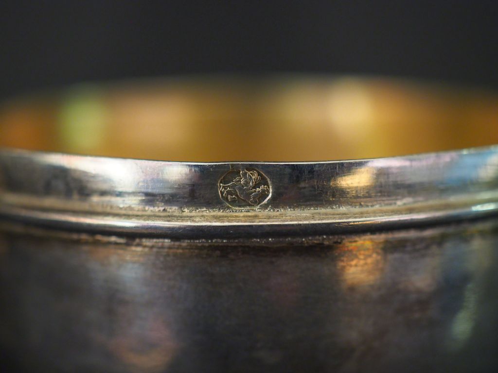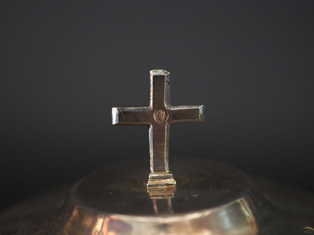 Ciboire de voyage fin XVIIIème - début XIXème, poinçon au coq, surmonté d'une croix. Le fut se dévissant et laissant découvrir une petite croix et un petit réservoir à Saint Chrême. H. 13 cm Poids. 131 g