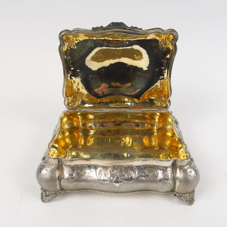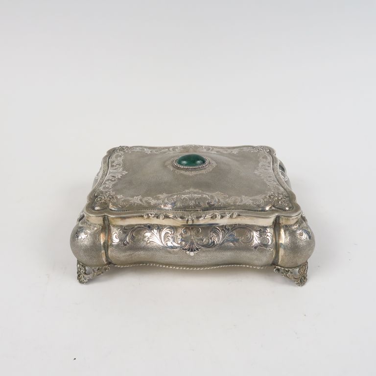 Coffret de style rocaille en argent 800 millièmes, à décor de rinceaux feuillagés, couvercle orné d'un cabochon de malachite. Poids. 797 g