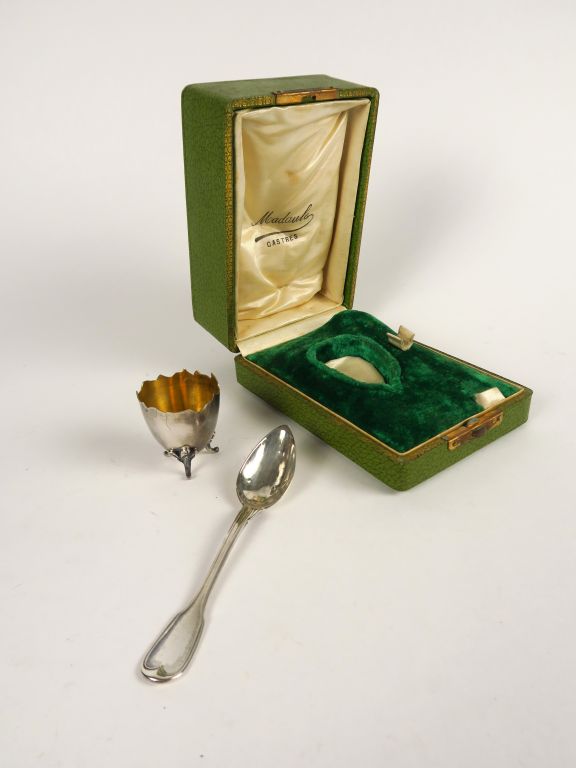 Coquetier tripode et cuillère, l'ensemble en argent, poinçon Minerve. Poids : 50 g. Dans un écrin