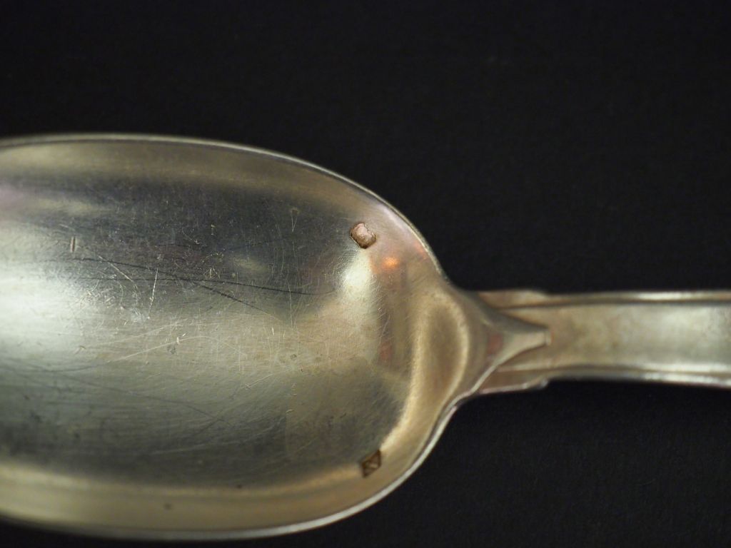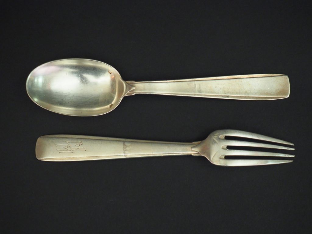 Couvert de naissance de style Art déco en argent, poinçon Minerve, à décor de monogramme. Poids. 93 g