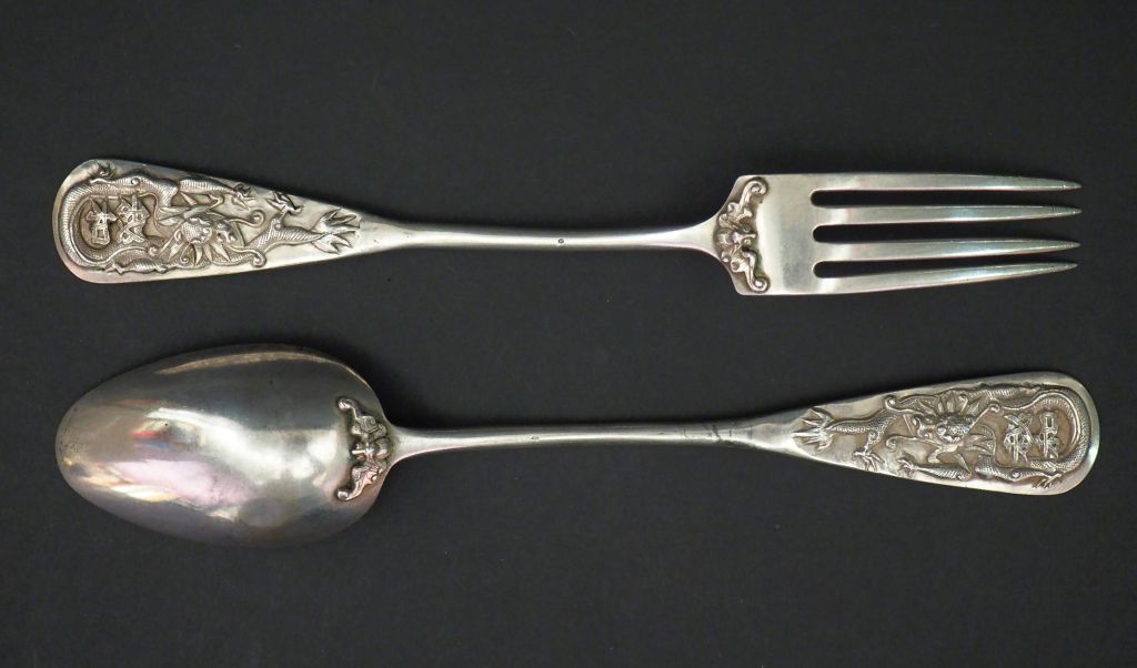 Couvert Extrême-Orient en argent, à décor appliqué de dragon. Poids.136 g