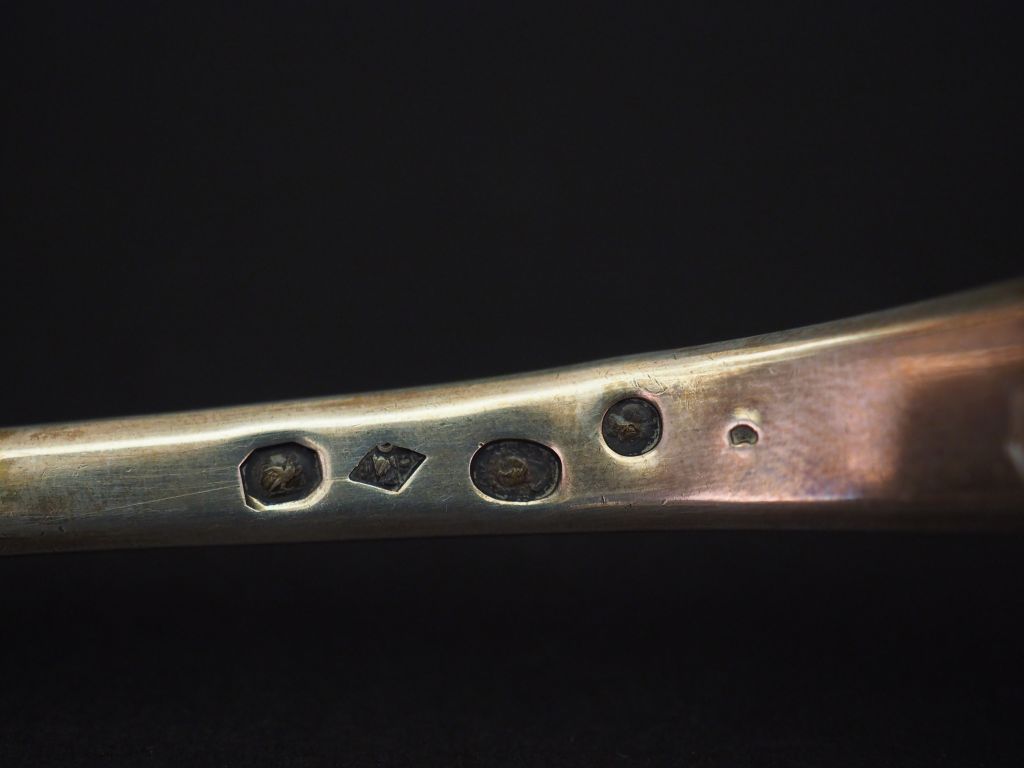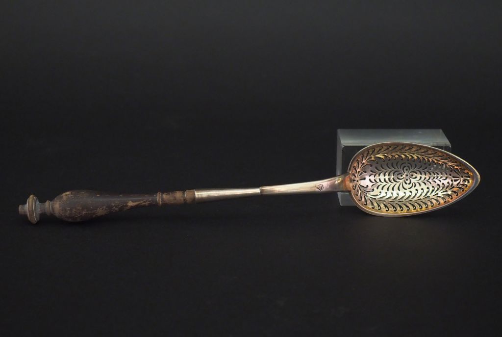 Cuillère à olives fin XVIIIème - début XIXème en argent, poinçon au Coq. Manche en bois anciennement noirci. Long. 28 cm Poids tel. 60 g