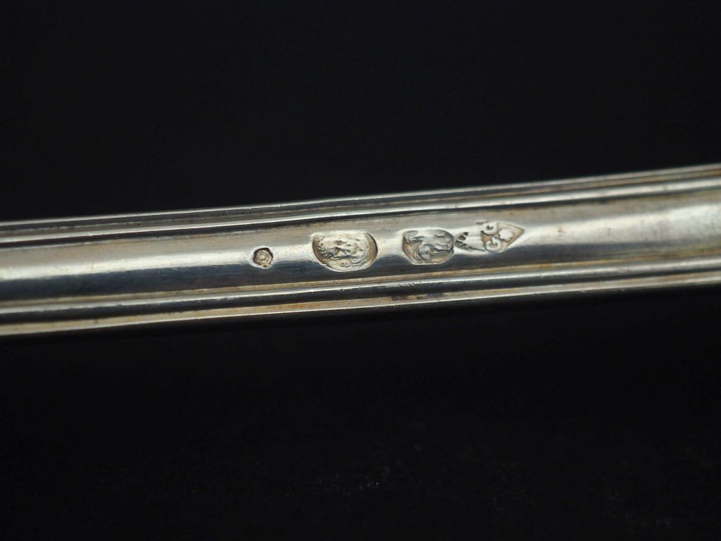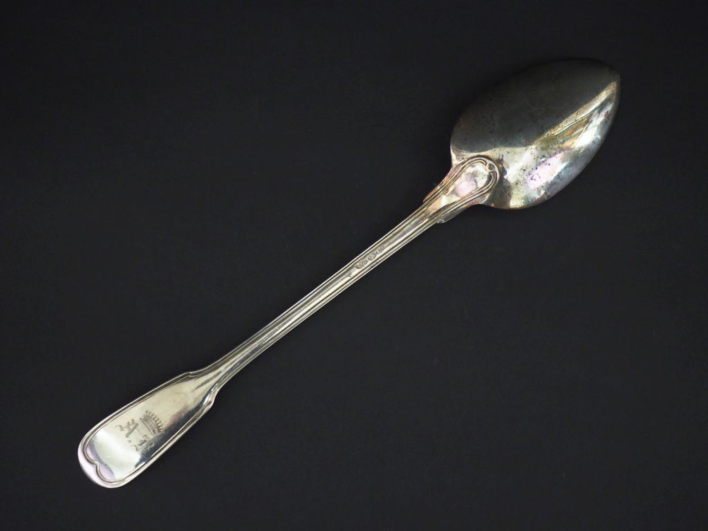 Cuillère à ragoût fin XVIIIème - début XIXème en argent 950, poinçon au 1er Coq, modèle à filet, à décor de monogramme surmonté d'une couronne. Long. 28,6 cm Poids. 128 g