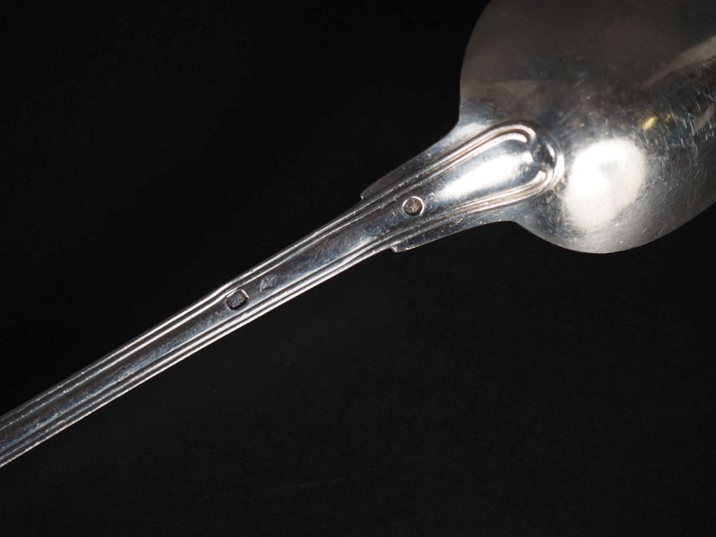 Cuillère à ragoût Restauration en argent 950, poinçon Vieillard, modèle à filet. Armoriée. Long. 28 cm Poids. 143 g