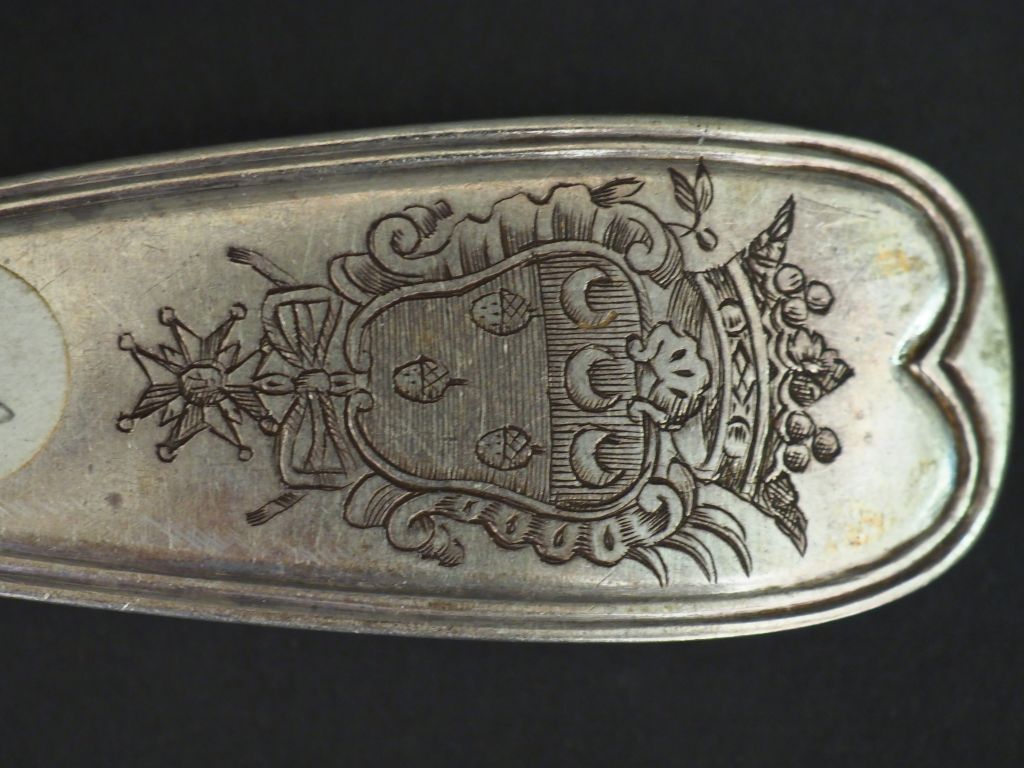 Cuillère à ragout XVIIIème en argent, modèle à filet, à décor d'armoiries. Long. 31,5 cm Poids : 184 g