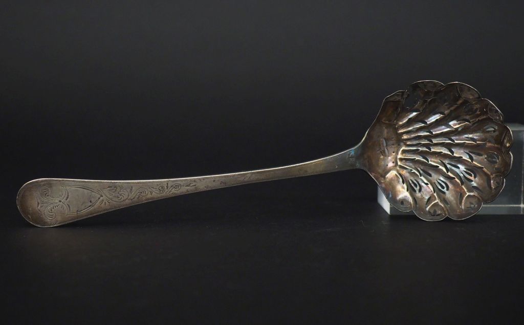 Cuillère à saupoudrer Restauration en argent, poinçon Vieillard, à décor gravé d'écusson et de rinceaux. Long. 22 cm Poids.53 g (accidents)