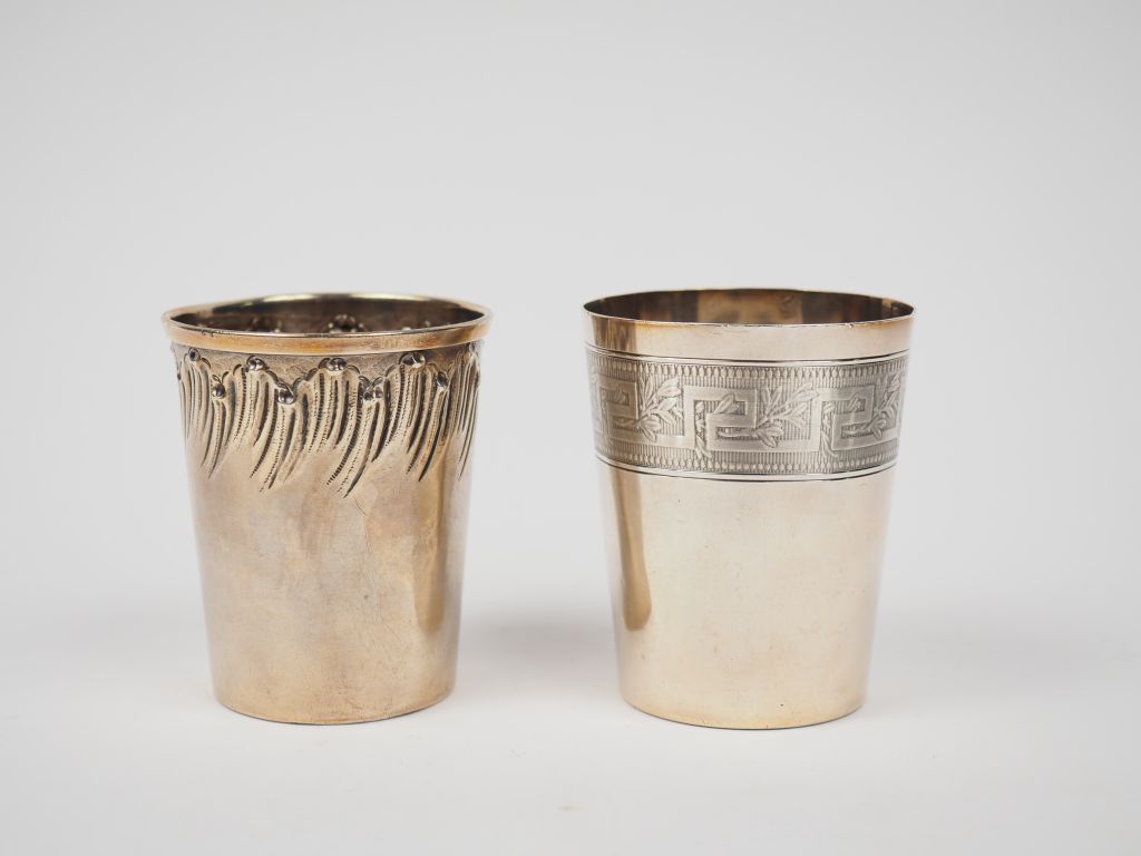 Deux différentes timbales en argent, poinçon Minerve. L'une à décor de grecque, l'autre de style Louis XV. Poids. 140 g