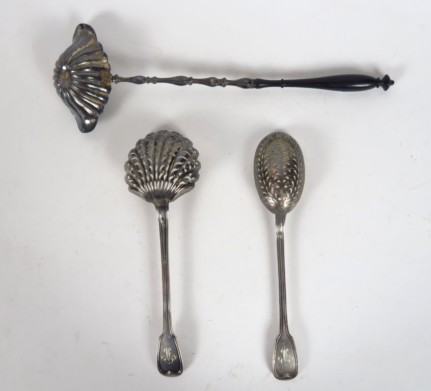 Deux différents saupoudroirs en argent modèle à filet, monogrammés. On y joint une louche à punch en argent, poinçon Minerve. Poids tel. 163 g