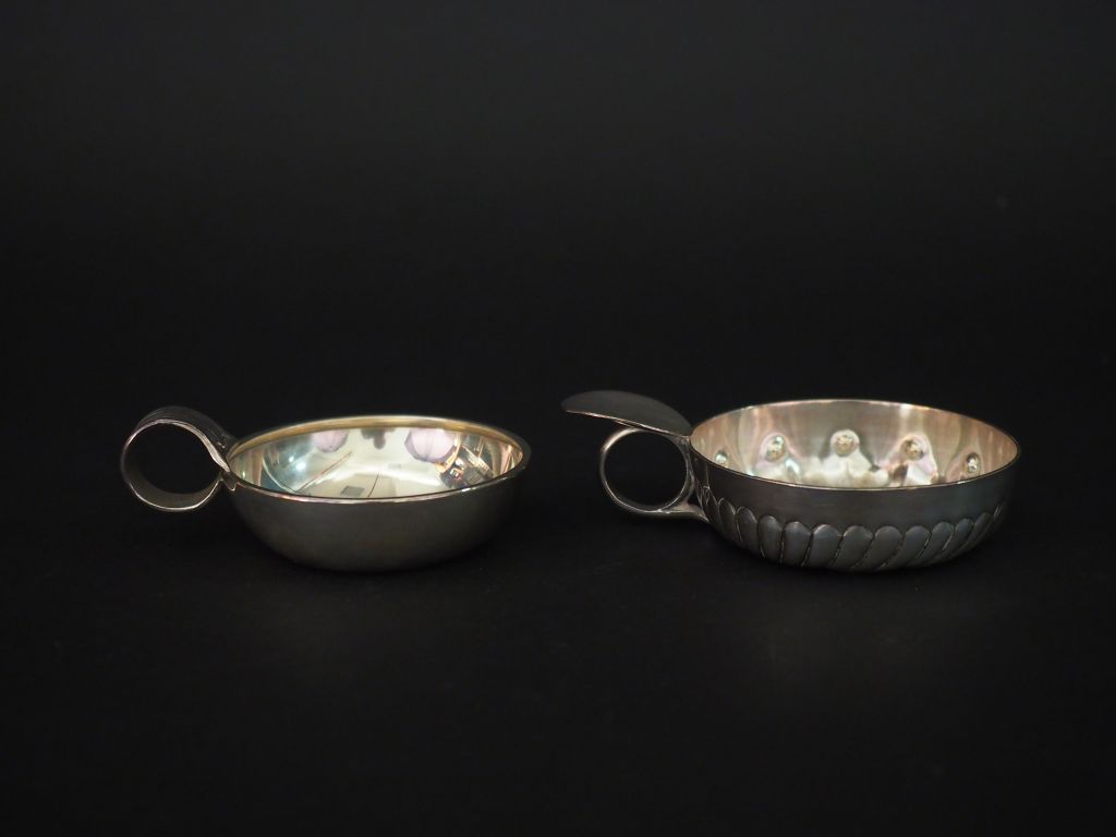 Deux différents tastes vin en argent, poinçon Minerve. L'un en argent lisse, la prise godronné. L'autre, à décor de cotes torses. Long. 10,5 cm et 9 cm Poids.136 g
