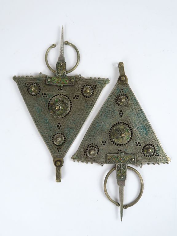 Deux grandes fibules en argen bas titre, traces d'émaux. Poids : 680 g