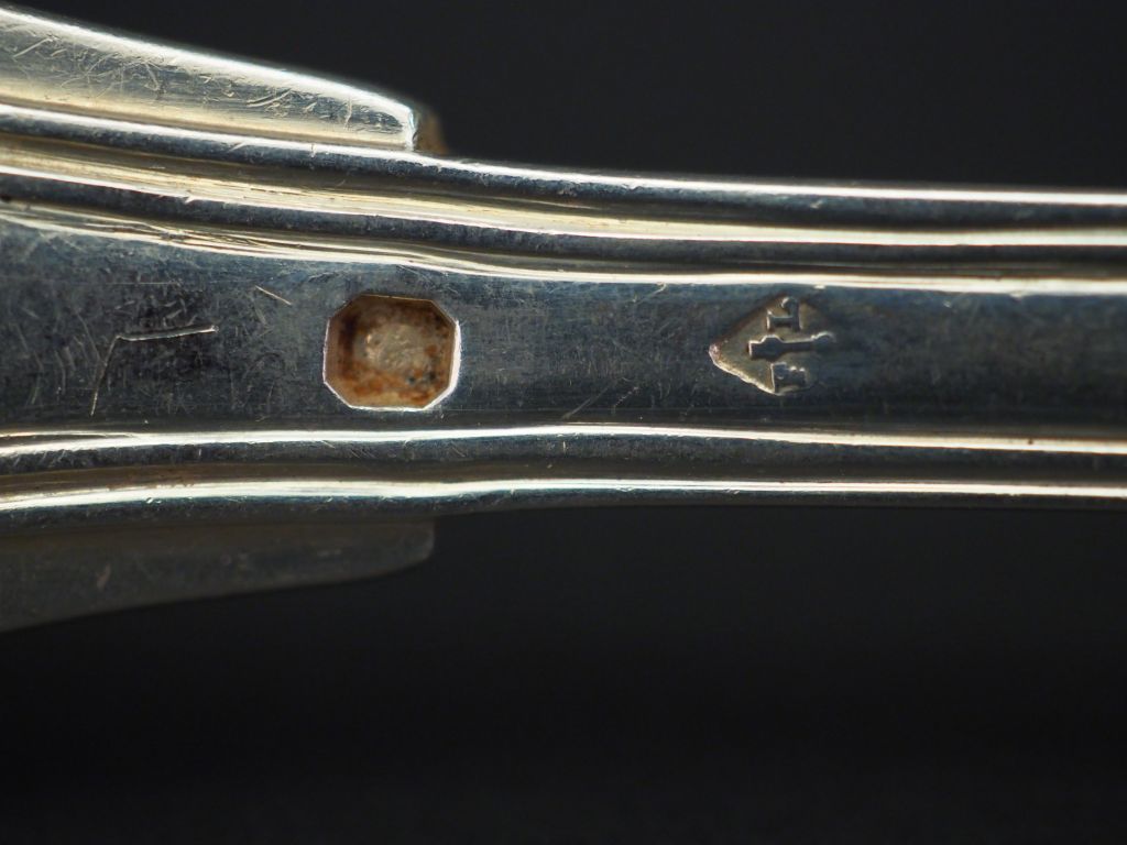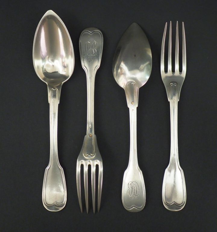 Deux grands couverts en argent, poinçon Minerve, modèle à filet. Monogrammés. Poids. 328 g