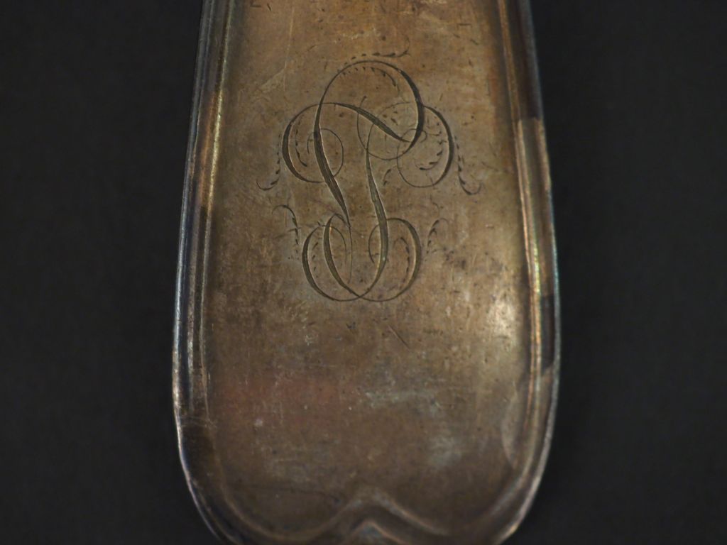 Deux louches en argent, poinçon Minerve, modèle à filet. Mongrammées. Long. 33,5 cm Poids : 488 g