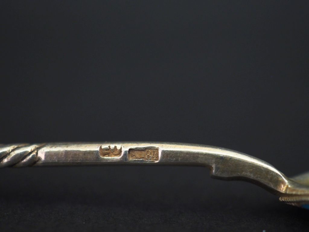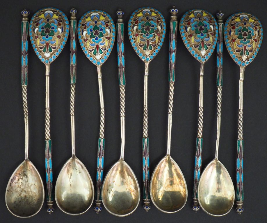 Dix petites cuillères à thé en vermeil et émail cloisonné. Moscou, début du XXe siècle. Le dos du cuilleron à décor floral en émail cloisonné polychrome sur fond amati, le bord de perle en émail bleu ciel. Le manche en partie torsadé est terminé par une section à pans en émail cloisonnée surmontée d'un bouton décoré de perles d'émail. Poinçons : 84, Moscou après 1908 et orfèvre « ЕО» (non répertorié). Longueur : 13.8 cm , Poids brut : 210 g