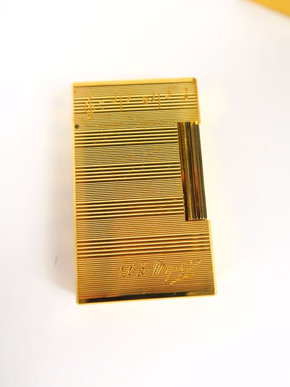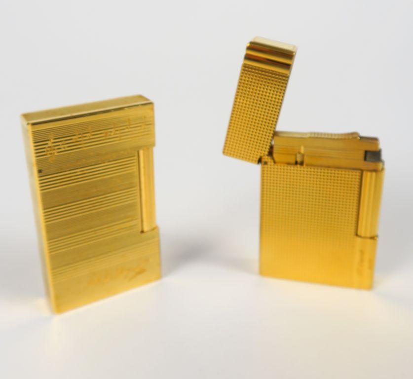 DUPONT. Deux briquets en métal doré, dont un gravé de partitions