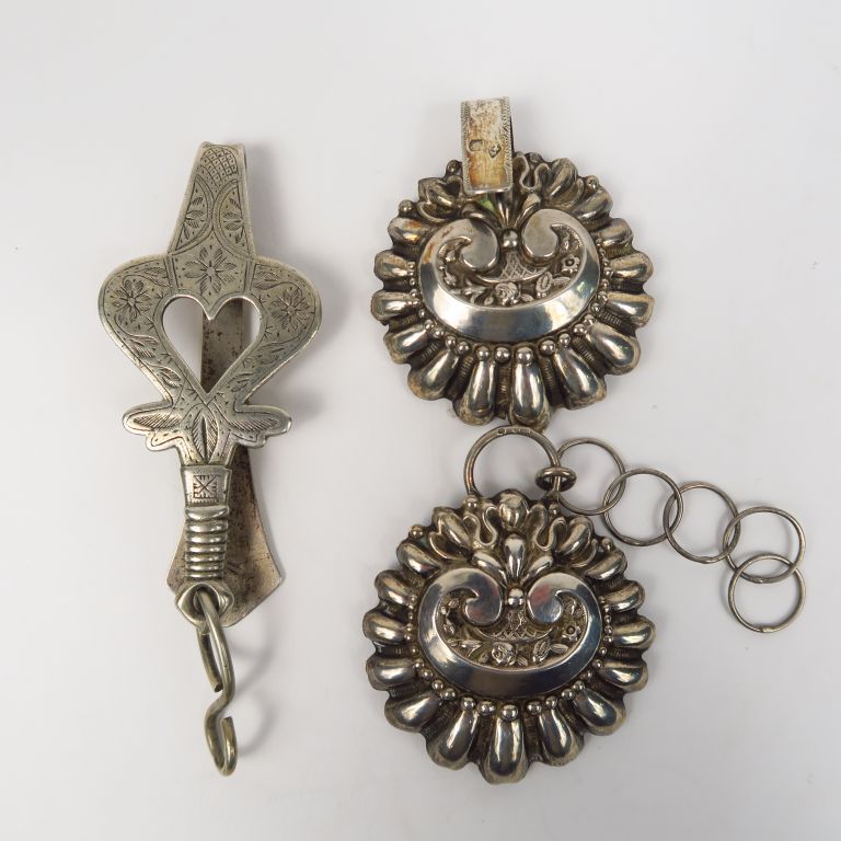 Elément de chatelaîne en argent, poinçon Minerve. On y joint une boucle de ceinture en argent, poinçon Minerve. Poids. 56 g