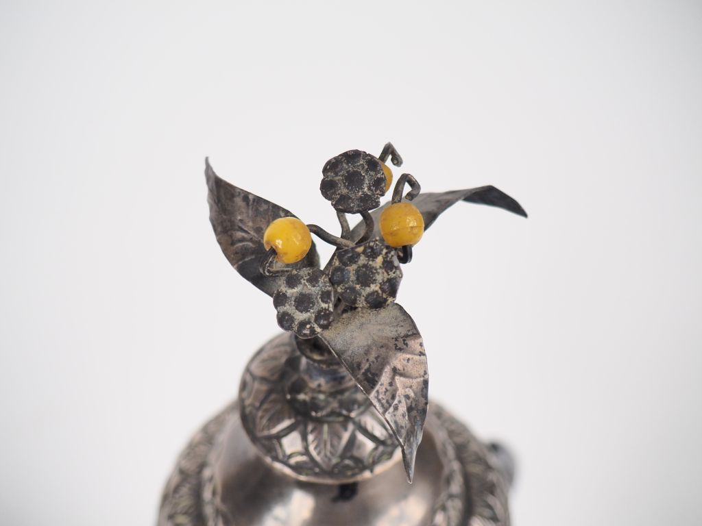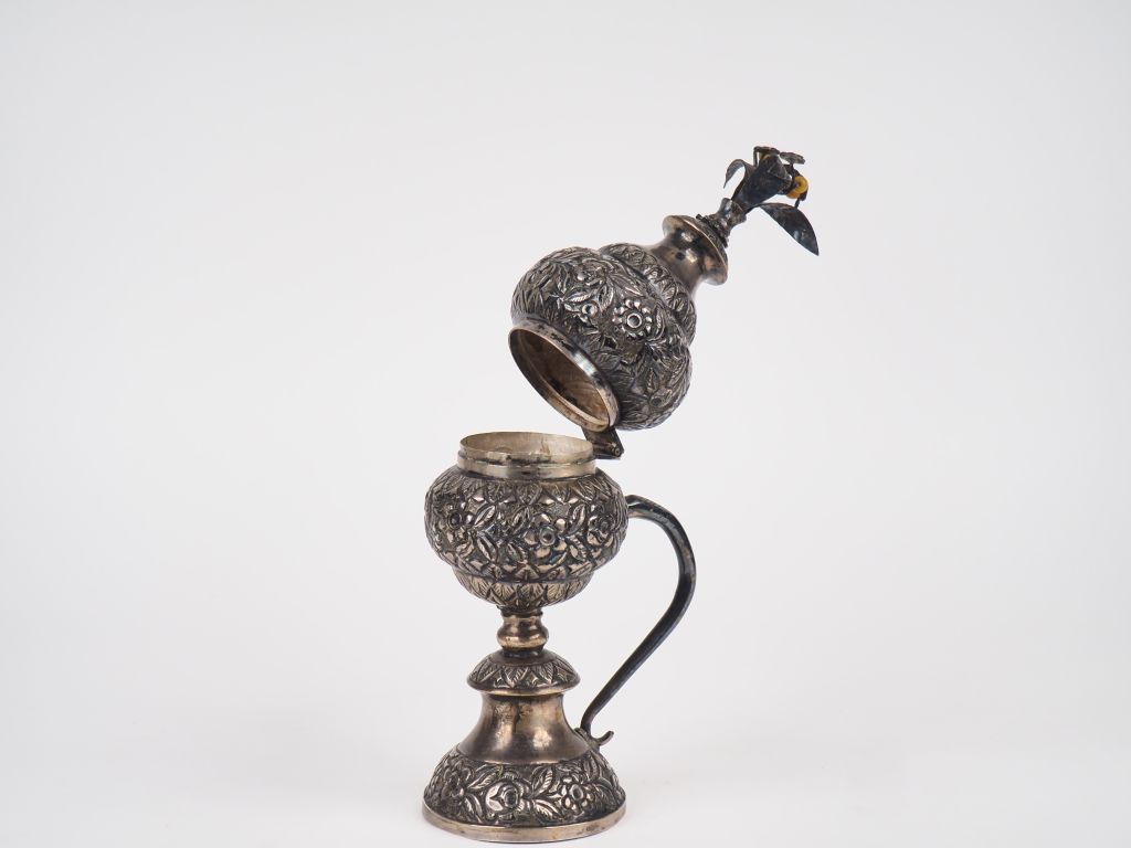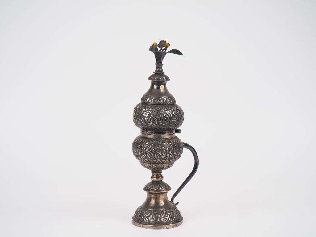 Encensoir Afrique du Nord en argent bas-titre à décor de rinceaux feuillagés et de fleurs. Poids tel. 496 g. H. 31 cm.