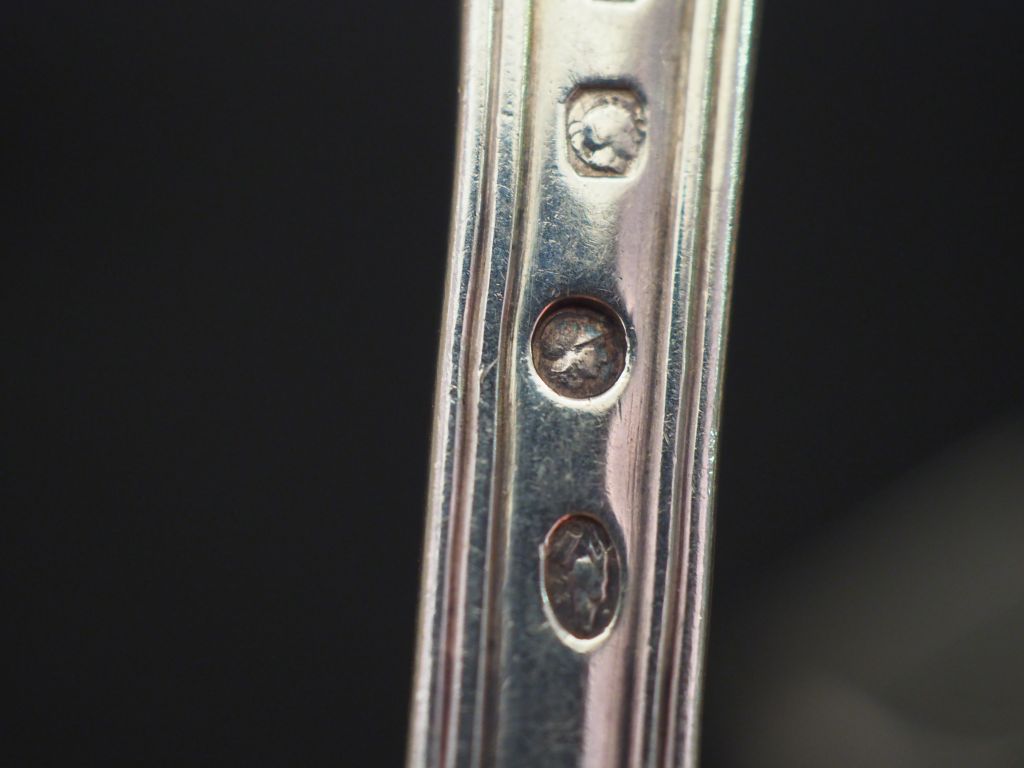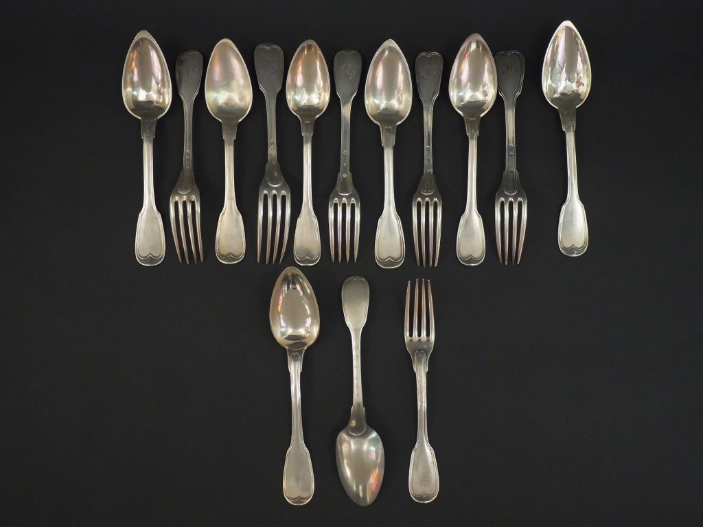 Ensemble comprenant : - cinq grands couverts et une cuillère en argent, poinçon Vieillard, modèles à filet dépareillés. Monogrammés. - deux grandes cuillères et une fourchettes en argent, poinçon au Coq, modèles à filet dépareillés. Monogrammés. Poids. 1140 g