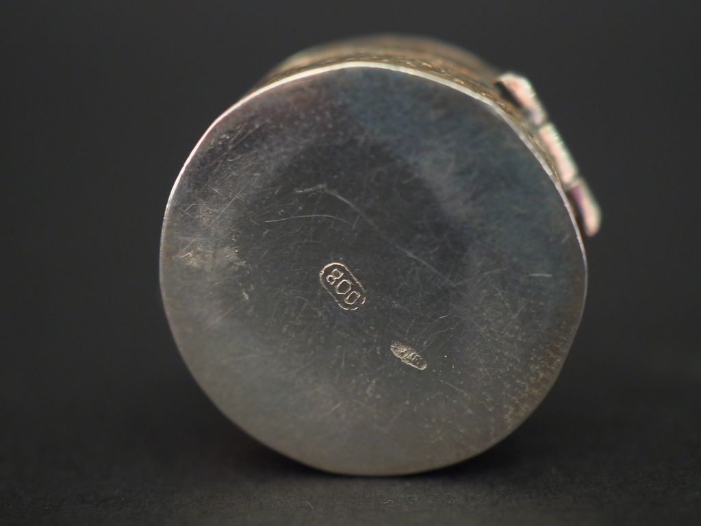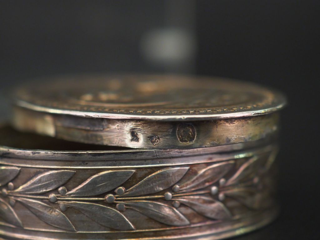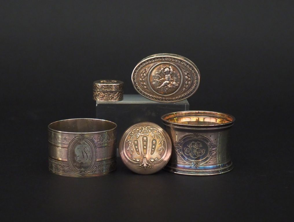 Ensemble comprenant : - deux dfférents ronds de serviette en argent, poinçon Minerve, à décor de cartouche monogrammé. - une petite boite ovale de style Louis XVI en argent, poinçon Minerve, à décor d'amour et de frise de feuilles de laurier. 1,6 x 5 x 3,6 cm (accident) - petite boite à pilules de style Louis XVI en argent, à décor de nœud de ruban. H. 1,7 cm - une petite boite en argent 800, à décor de fleur de lys. H. 1,5 cm Poids. 111 g