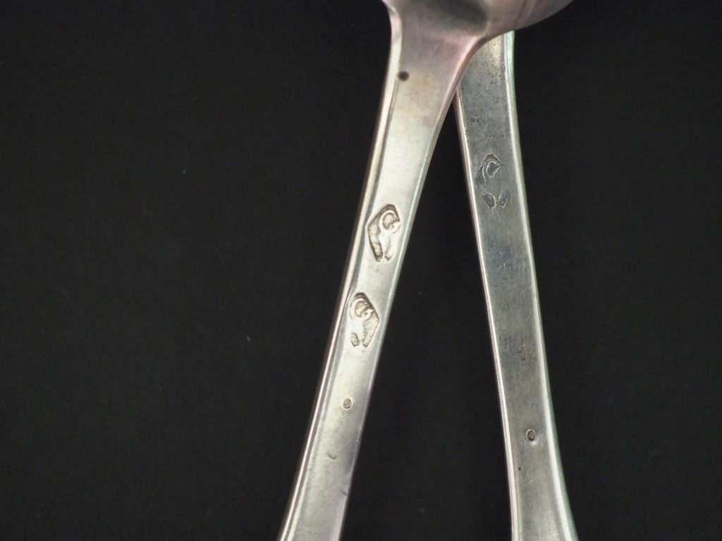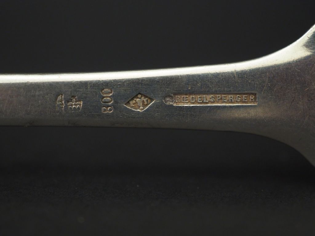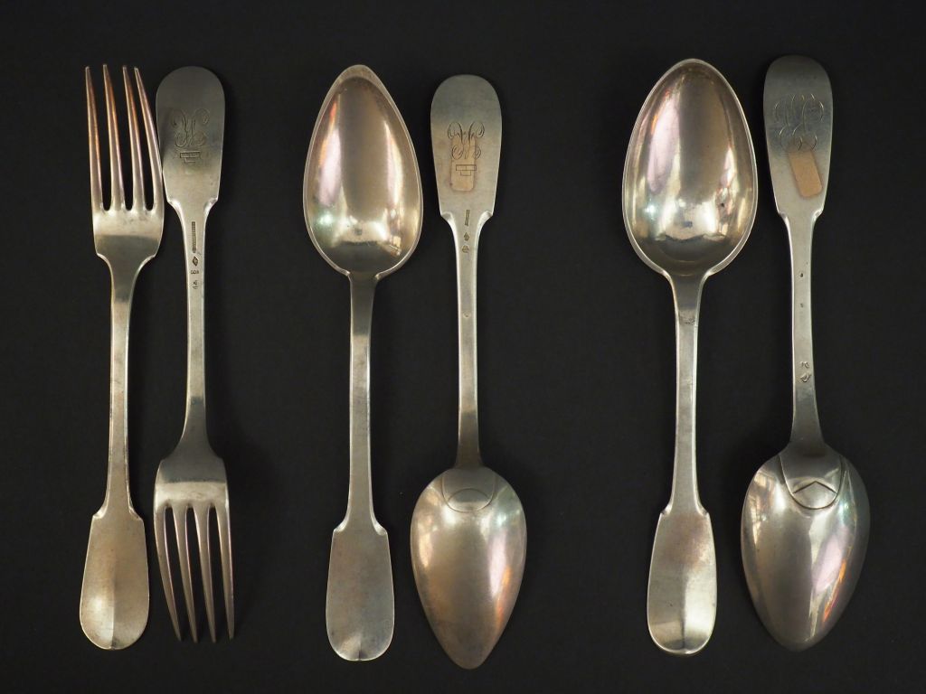 Ensemble comprenant : - deux grandes fourchettes et deux grandes cuillères assorties en argent 800 allemand. M.O : Roedelsperger et Kruger - deux grandes cuillères assorties en argent, modèle uniplat. Monogrammées. Poids. 465 g