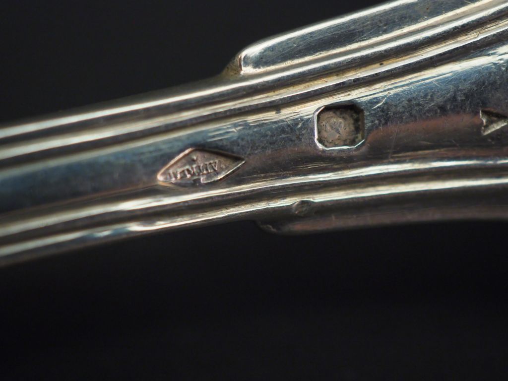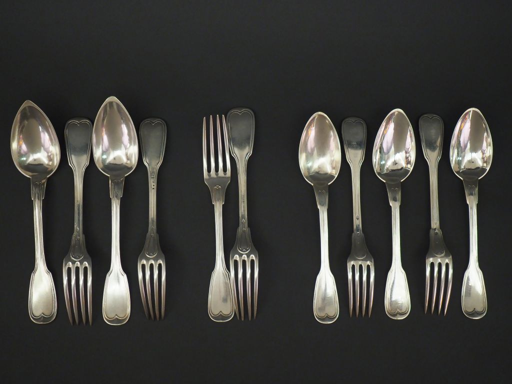 Ensemble comprenant : - deux grands couverts et deux fourchettes en argent, poinçon Minerve, modèle à filet. M.O : E. Mattreau - deux grands couverts et une cuillères en argent, poinçon Minerve, modèle à filet. M.O : R.B Poids. 880 g