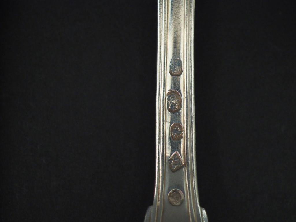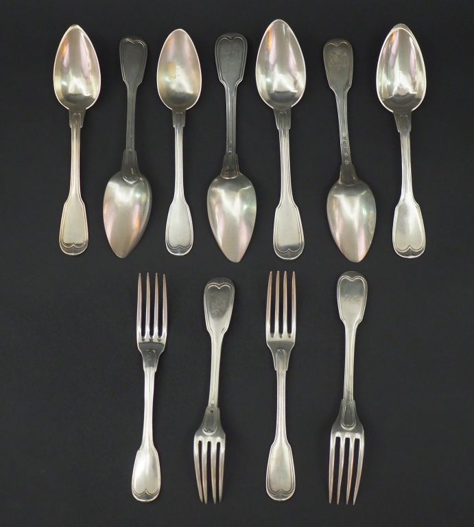 Ensemble comprenant sept grandes cuillères et quatre grandes fourchettes en argent, poinçons dépareillés, modèles à filet. Monogrammés ou armoriés. Poids. 907