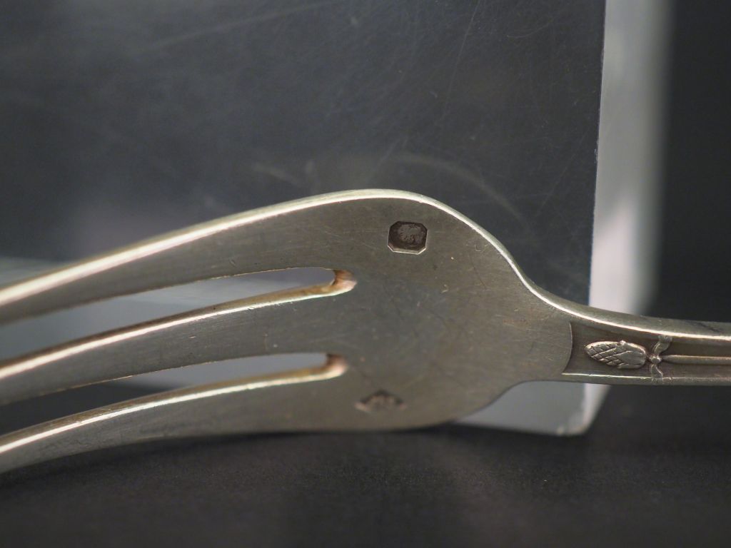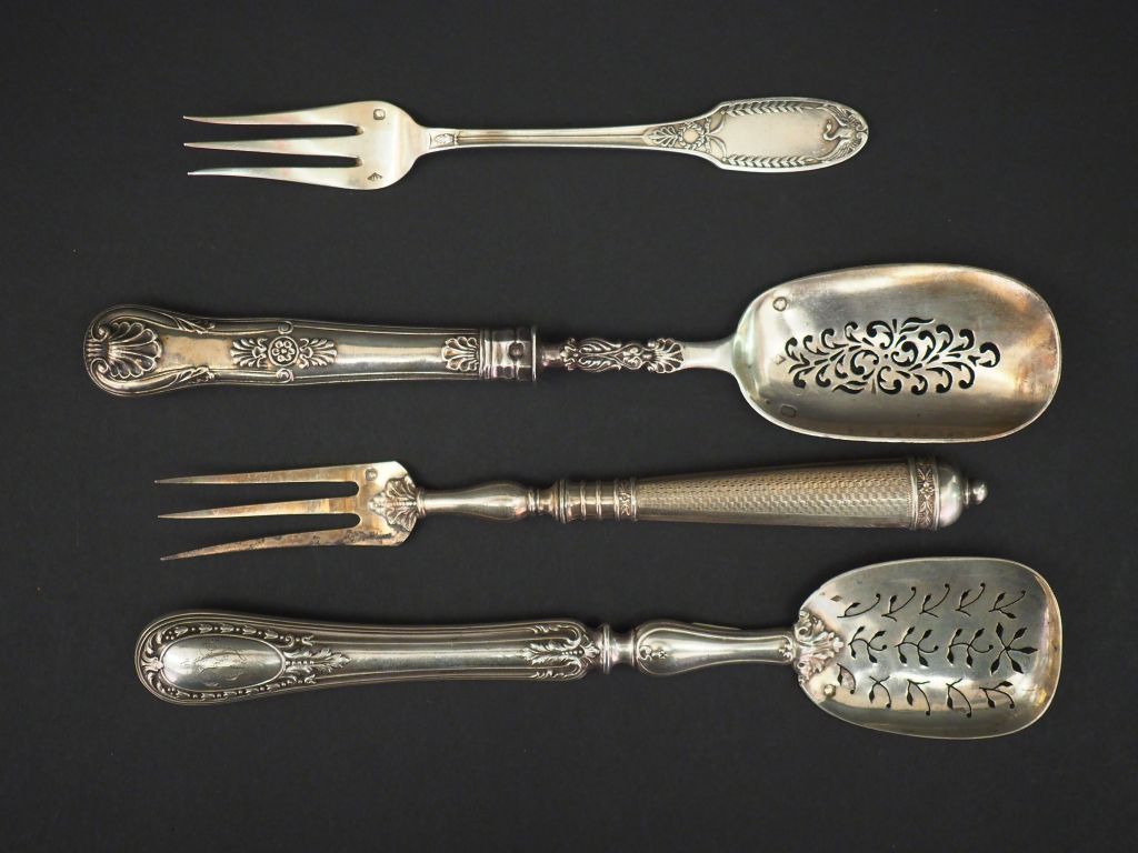 Ensemble comprenant : - trois différents éléments de nécessaire à douceur en argent et argent fourré. - un fourchette à fruit de style Empire en argent, poinçon Minerve, à décor de cygnes aux ailés déployées. Monogrammée. M.O : E. Puiforcat Poids tel. 149 g