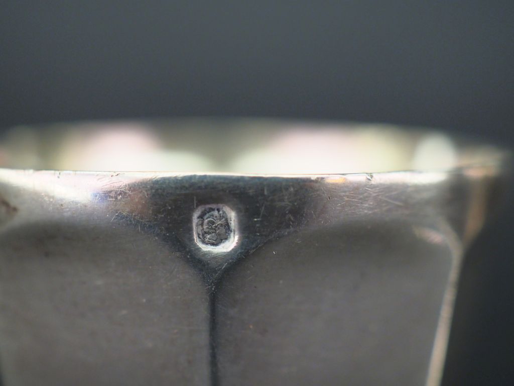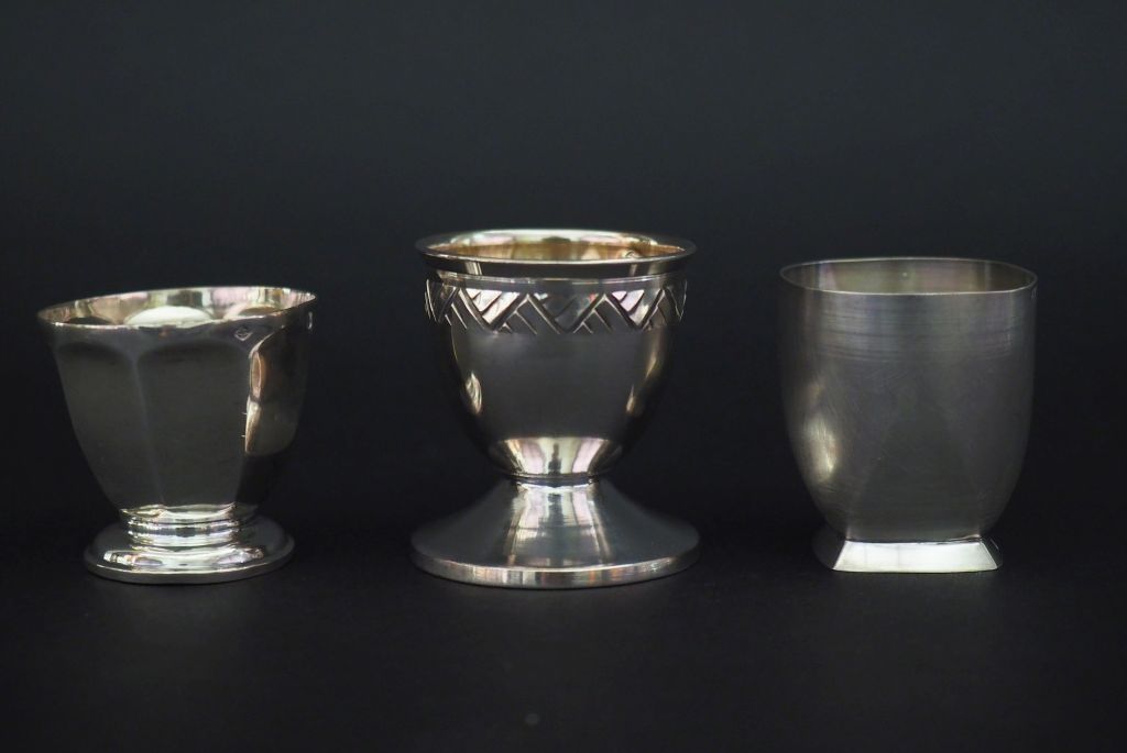 Ensemble comprenant : - un coquetier de style Art déco en argent, poinçon Minerve. H. 4,5 cm - un coquetier à pans coupés en argent, poinçon Minerve. H. 4,3 cm - un coquetier de style Art déco en argent, poinçon Minerve, à décor de frise de motifs géométriques. H. 5 cm Poids. 68 g
