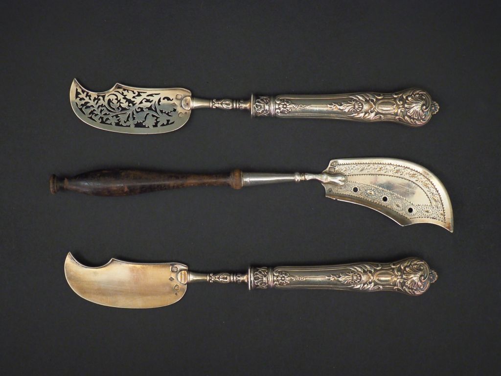 Ensemble comprenant : - un couteau à poisson Restauration en argent, poinçon Vieillard. Manche en bois. M.O : A.M Long. 21 cm - deux couteaux à poisson Restauration assortis, en argent et argent fourré, poinçon Vieillard, à décor de rinceaux, coquilles et fleurs. M.O : E.G Poids tel.108 g