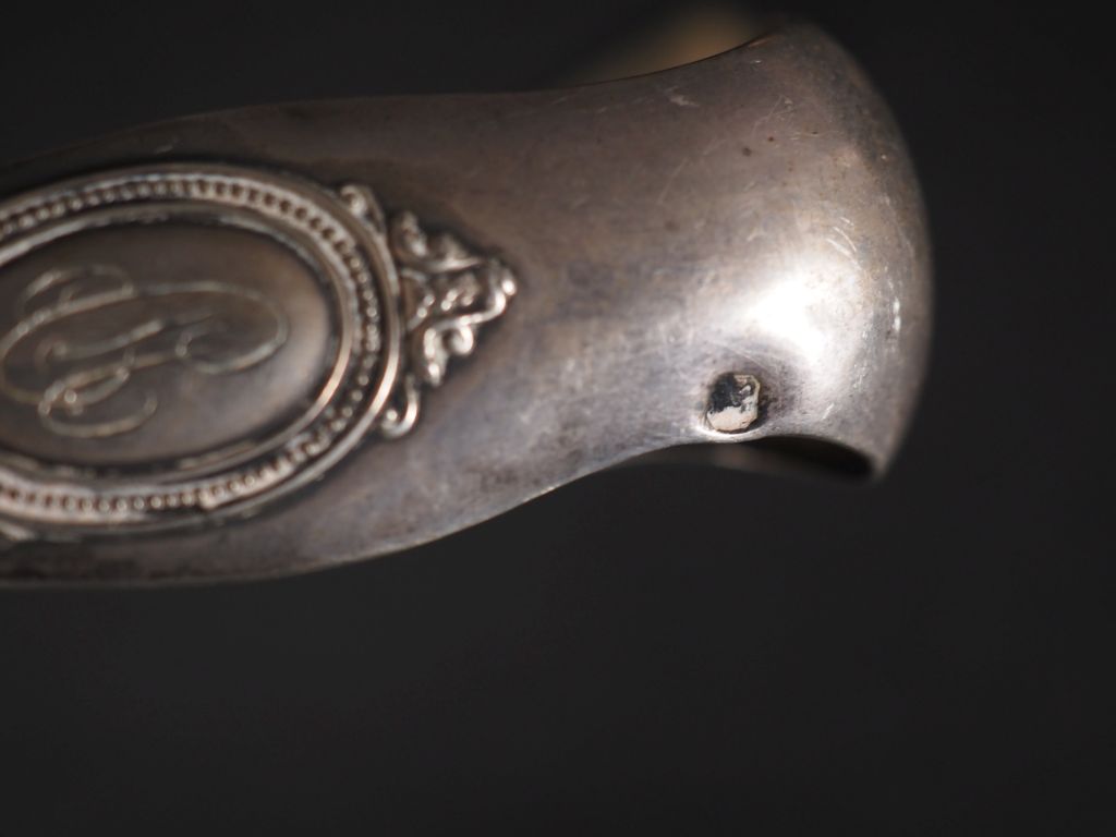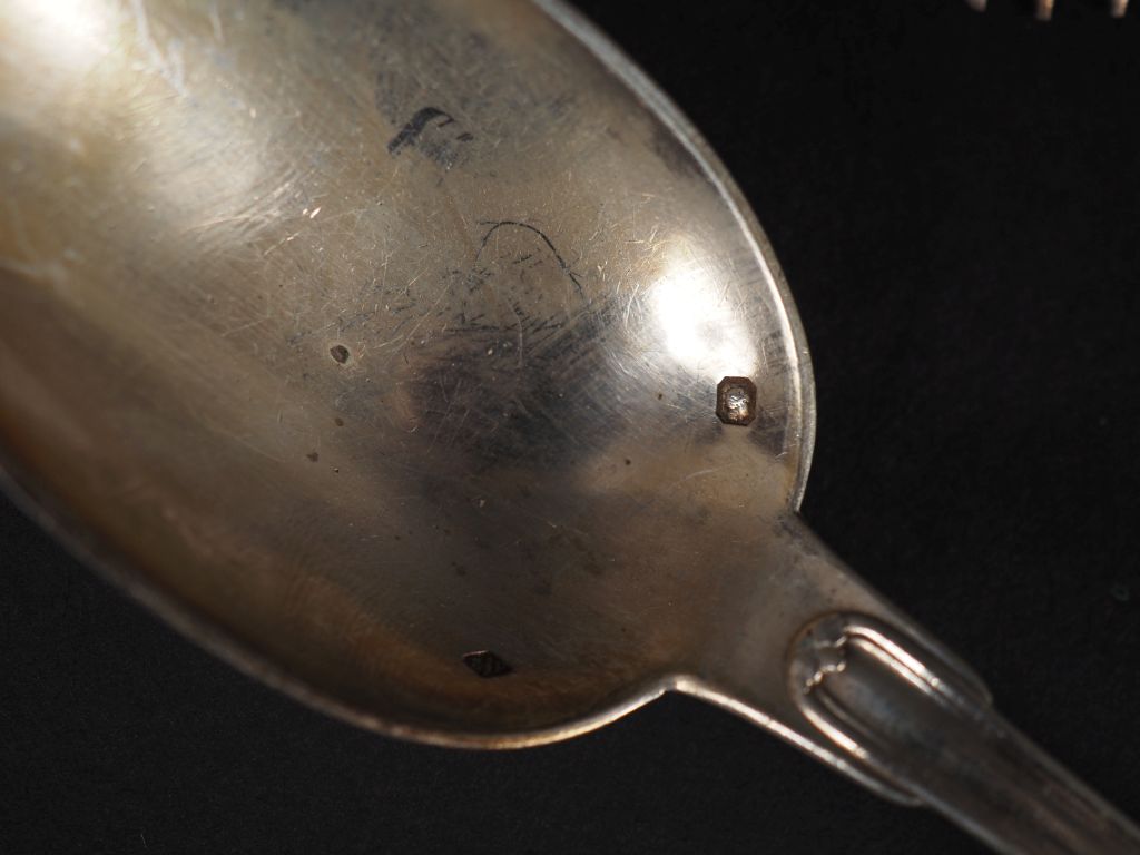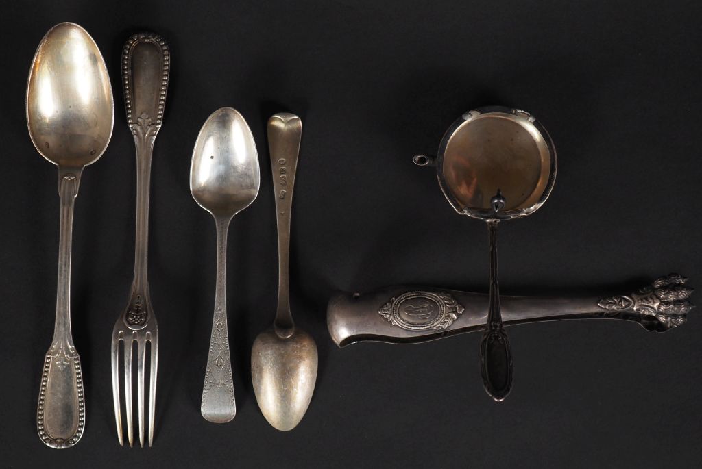 Ensemble comprenant : - un couvert à entremets en argent 925, poinçon Minerve, à décor de rangs de perles et feuilles d'acanthe. M.O : E. PUIFORCAT - deux petites cuillères en argent anglais, à décor gravé de feuillage. Long. 13,3 cm - une pince à sucre en argent 925, poinçon Minerve, à décor de cartouches monogrammés et terminée en griffes. M.O : H.G Long. 14,5 cm - une cuillère passette à thé (?) de style Louis XVI en argent 925, poinçon Minerve, à décor de tiges enrubannées, feuillage et nœuds de ruban. Long. 12 cm (manques et accidents) Poids. 173 g