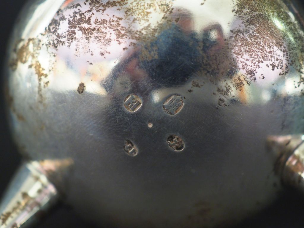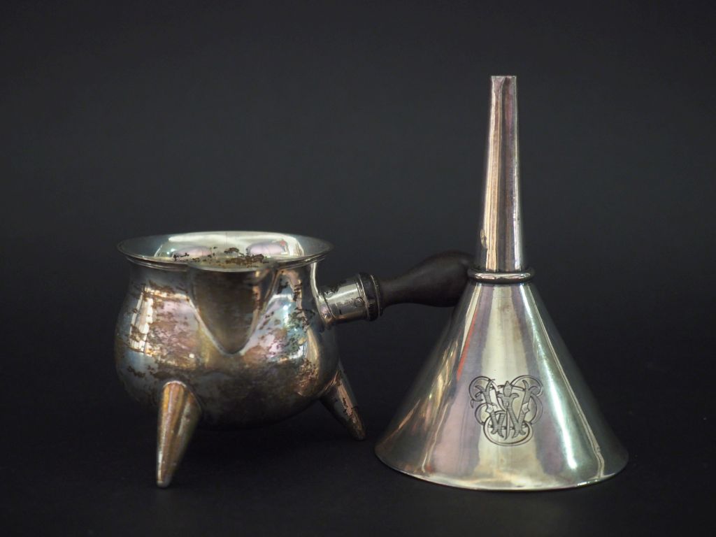 Ensemble comprenant : - un entonnoir Restauration en argent, poinçon Vieillard, à décor de monogramme. H. 11 cm Poids. 60 g - une petite verseuse tripode en argent lisse étranger. Manche latéral en bois noirci. H. 6 cm Poids tel. 55 g