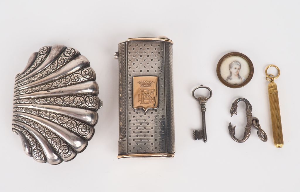 Ensemble comprenant : - un étui à briquet (?) en argent et vermeil, à décor de cartouche monogrammé sur fond de semi de pois.. Dim. 6,5 x 3,5 cm Poids. 49 g - une boîte à pilule en argent en forme de coquille, à décor de rinceaux. Dim. 6,5 x 5 cm. Poids. 35 g - une petite miniature figurant un portrait de dame. Diam. 2 cm. - une clé miniature en argent. L. 3 cm Poids. - un porte-mine en or jaune 750, à décor de cannelures. L. 7,5 cm. Poids tel. 5 g - un petit pendentif en argent, figurant deux chimères affrontées. L. 3 cm. Poids. 6 g