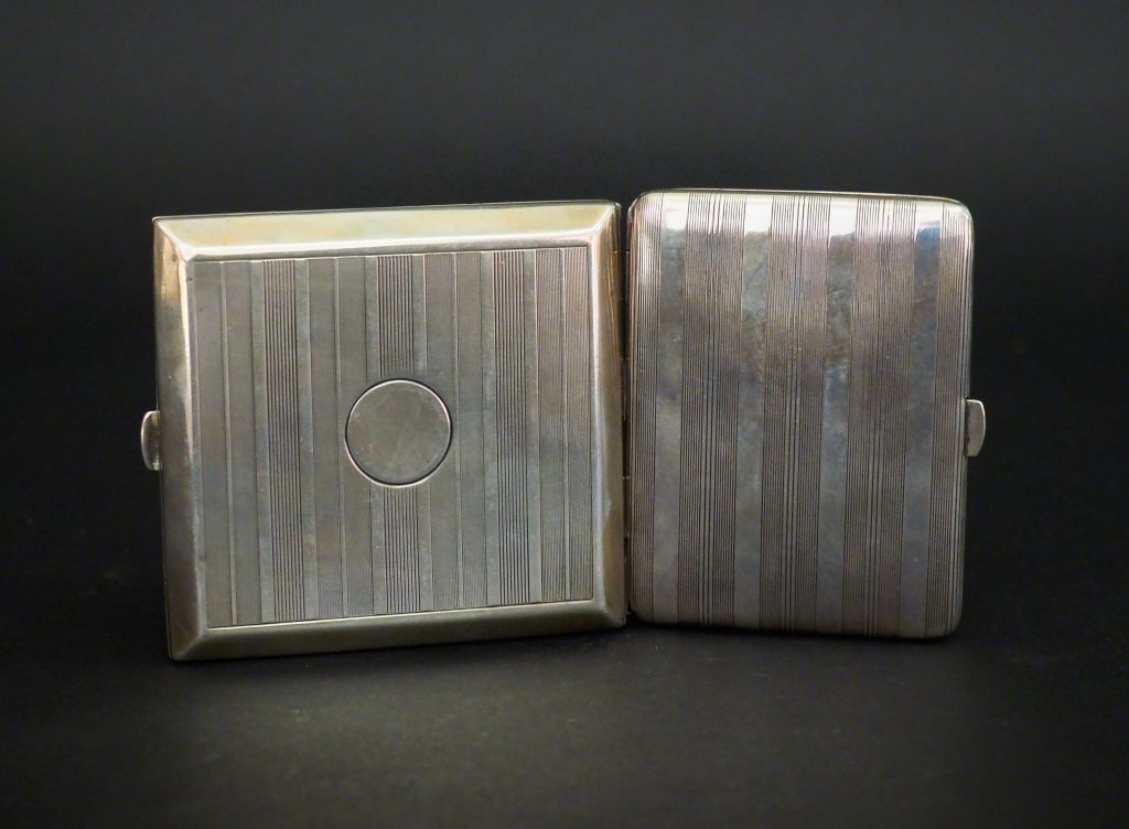 Ensemble comprenant : - un étui à cigarettes de style Art déco en argent, poinçon Minerve, à décor géométrique et d'un cercle en son centre. 1,6 x 8,7 x 9,2 cm - un étui à cigarettes de style Art déco en argent. 9 x 6,7 cm Poids. 210 g