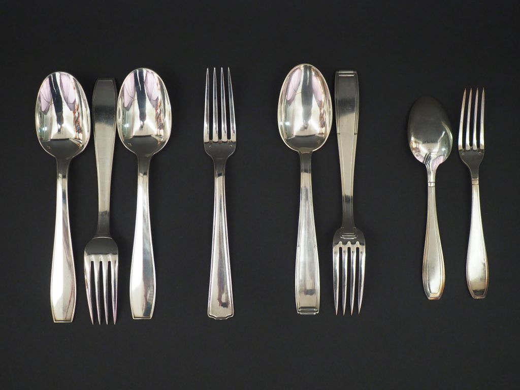 Ensemble comprenant : - un grand couvert et une grande cuillère de style Art déco en argent, poinçon Minerve. - une grande fourchette de style Art déco en argent, poinçon Minerve. - un grand couvert de style Art déco en argent, poinçon Minerve. - un couvert à entremets de style Art déco en argent, poinçon Minerve. Poids. 631 g