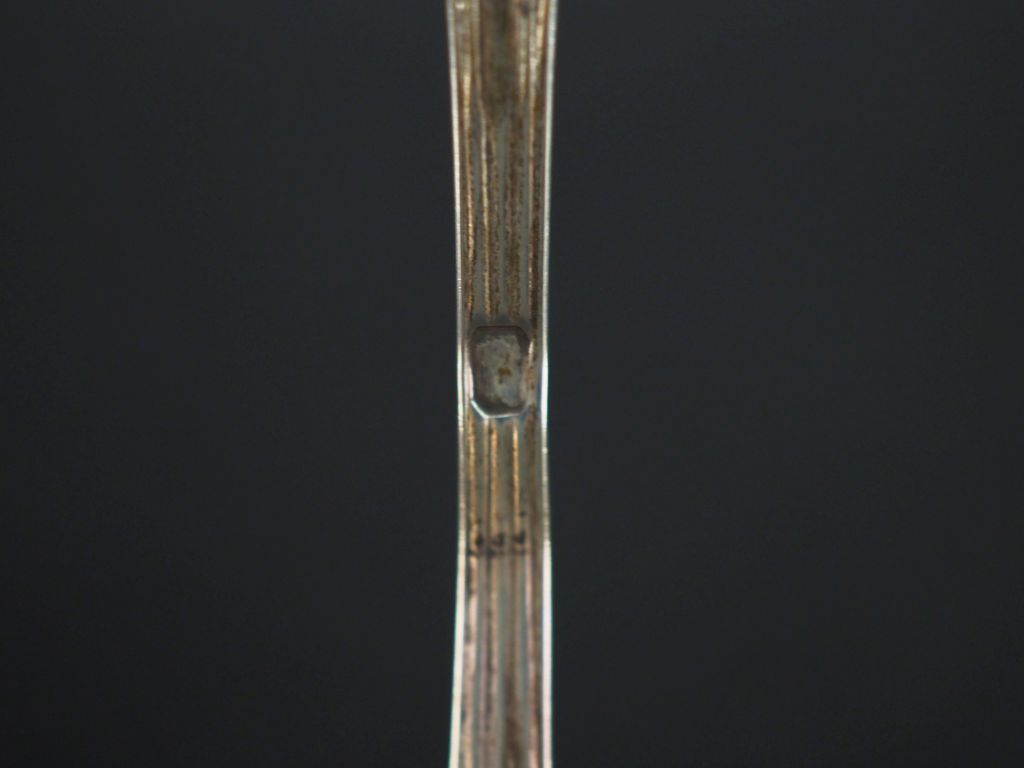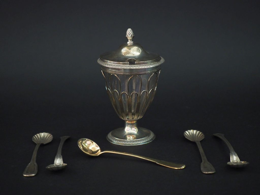 Ensemble comprenant : - un moutardier Restauration en argent, poinçon Vieillard, à décor ajouré. Les bords du couvercle et de la base ornés d'une frise de feuille d'eau. Prise du couvercke en forme de gland. Avec sa verrine. H. 13 cm Poids. 150 g - une cuillère à moutarde Restauration en vermeil, poinçon Vieillard. Monogrammée. Poids. 13 g - une paire de cuillères à sel Restauration en argent, poinçon Vieillard, à décor de coquille et de monogramme dans une couronne de feuille de laurier. Poids. 21 g - une paire de cuillères à sel Restauration en argent, poinçon Vieillard, à décor de coquille, modèle à filet. Poids. 19 g et une cuillère Restauration à moutarde en vermeil et quatre pelles à sel en argent à décor de coquille. l’ensemble. 396 g