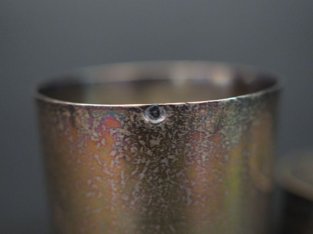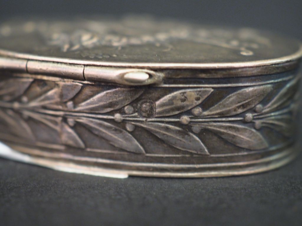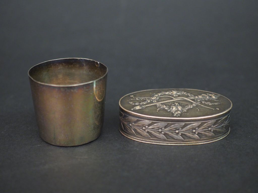 Ensemble comprenant : - un petit verre à liqueur en argent lisse, poinçon au coq. H. 3,5 cm Poids. 15,54 g - une boite à pilules ovale de style Louis XVI en argent et vermeil, poinçon Minerve, à décor de trophée sur le couvercle et de frise de feuilles de laurier. 1,5 x 5,7 x 3,5 cm Poids. 34,06 g