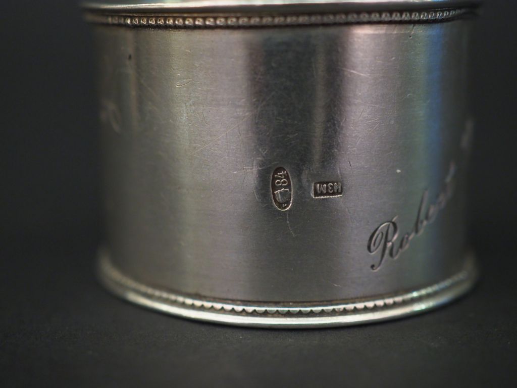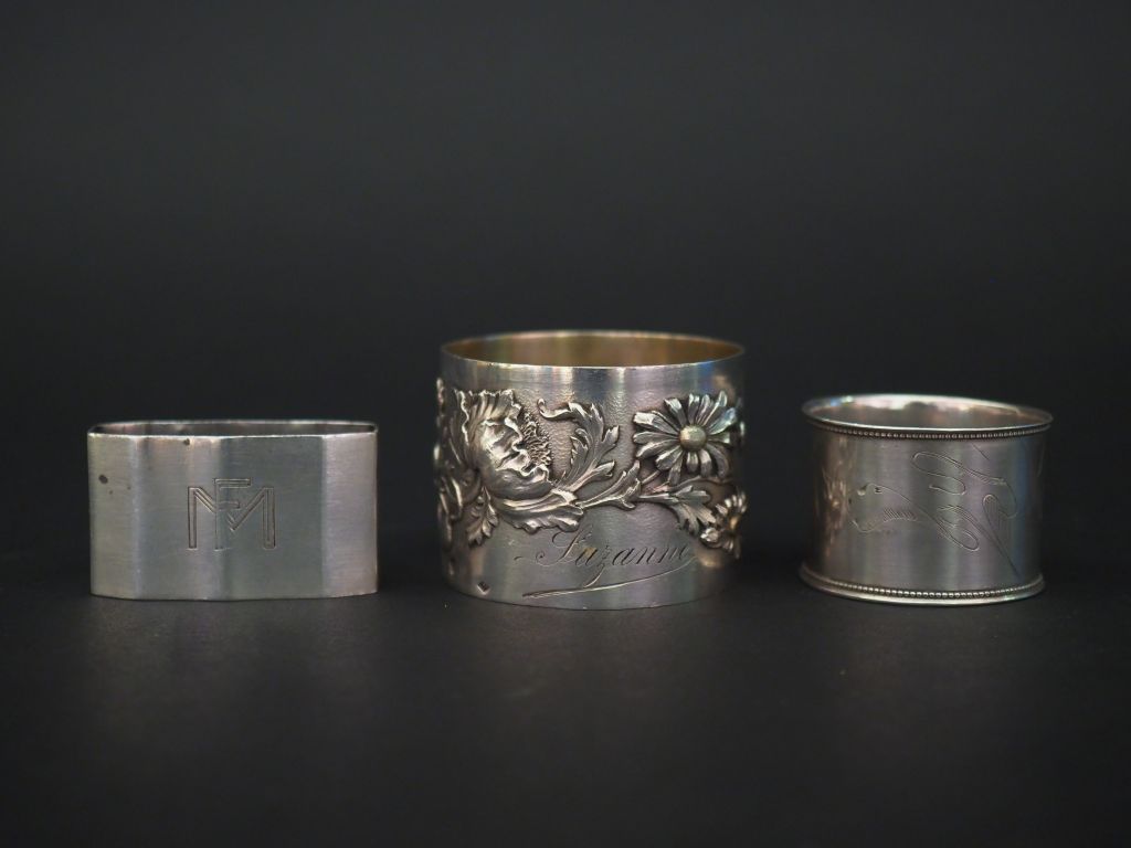 Ensemble comprenant : - un rond de serviette de style Art Nouveau en argent, poinçon Minerve, à décor de fleurs épanouies en léger relief. M.O : M.V (gravé Suzanne) - un rond de serviette de style Art déco en argent, poinçon Minerve, à décor de monogramme. M.O : L.L - un rond de serviette en argent, à décor de fleurs stylisée. (gravé) Poids. 100 g