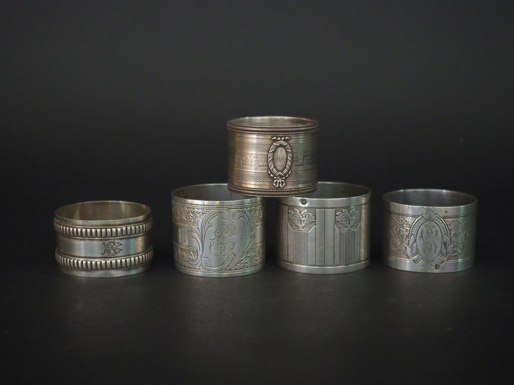 Ensemble comprenant : - un rond de serviette en argent, poinçon Minerve, à décor de frises de godrons. Monogrammé. H. 3 cm - un rond de serviette en argent, poinçon Minerve, à décor de frises de fleurons et de cartouche monogrammé. H. 4 cm - un rond de serviette de style Louis XVI en argent, poinçon Minerve, à décor de cartocuhe monogrammé. H. 3,7 cm - un rond de serviette de style Art déco en argent, poinçon Minerve, à décor de vases fleuris. H. 4 cm - un rond de serviette en argent, poinçon Minerve, à décor de rinceaux, feuillage et cartouche monogrammé. H. 3,5 cm Poids. 176 g