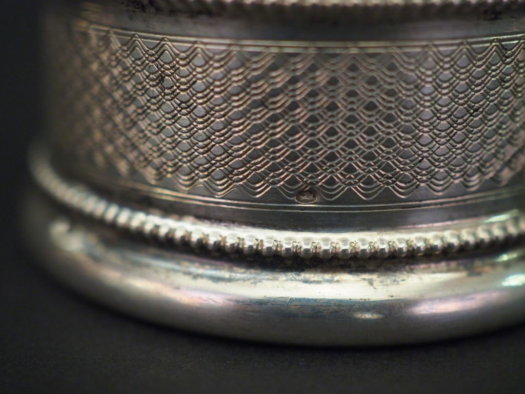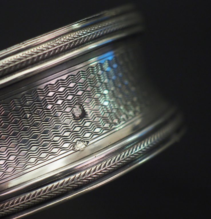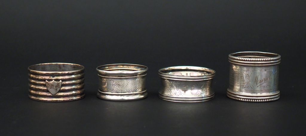 Ensemble comprenant : - un rond de serviette en argent, poinçon Minerve, à décor de rangs de perles et de cartouché. Marqué "Muriel". - un rond de serviette en argent, poinçon Minerve, à décor guilloché. Monogrammé dans un cartouche. - un rond de serviette en argent, poinçon Minerve, à décor de cartouche monogrammé sur fond guilloché. - un rond de serviette en argent, à décor d'écusson monogrammé. Poids. 82 g