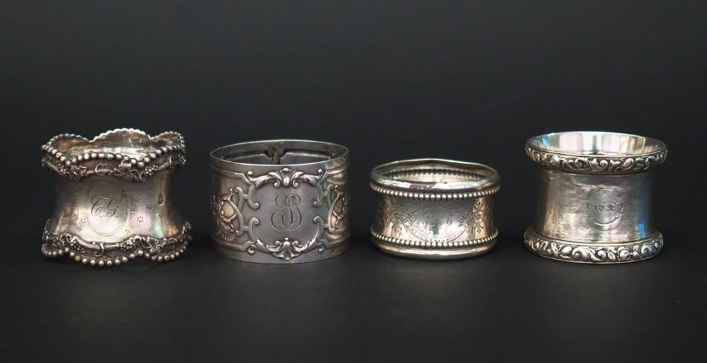 Ensemble comprenant : - un rond de serviette Napoléon III en argent, poinçon Minerve, à décor de rinceaux et fleurons. Monogrammé. - un rond de serviette en argent, poinçon Minerve, à décor de frises de rinceaux et de fleurs. Monogrammé. - un rond de serviette Napoléon III en argent, poinçon Minerve, à décor de pampres de vigne, de rangs de perles et de semis de fleur. Monogrammé. M.O : PB - un rond de serviette en argent, poinçon Minerve, à décor d'une frise de motifs géométriques et d'un cartouche monogrammé. Poids. 139 g
