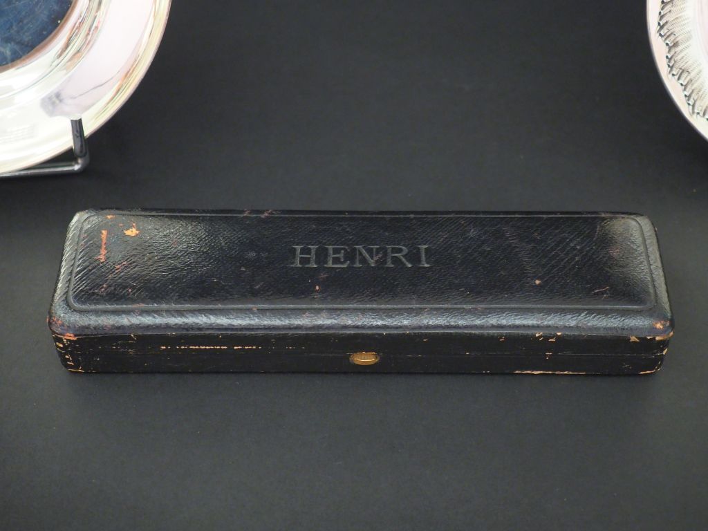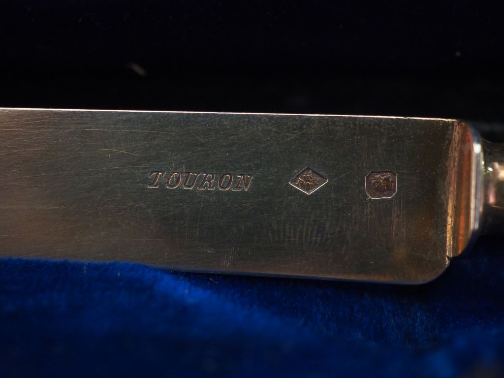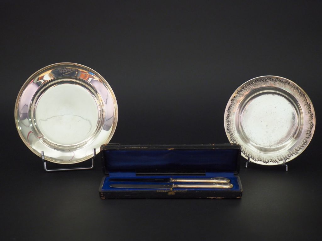 Ensemble comprenant : - une assiette à bouilli en argent, poinçon Minerve. Marquée William. M.O : Cardeilhac Diam. 16,7 cm - un dessous de bouteille de style Louis XV en argent, poinçon Minerve. M.O : H.S Diam. 14,8 cm - un coffret contenant deux couteaux de style Louis XVI, modèle à cartouche marqué "Henri". L'un d'eux lame argent. M.O : Touron à Paris. Dans leur coffret en cuir marqué "Henri". Poids tel. 319 g